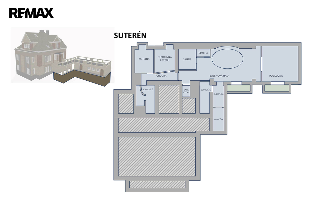 • Suterén: Wellness zóna s vnitřním bazénem s protiproudem, klimatizovaným fitness, saunou a temperovaným vinným sklepem pro vaši archivní sbírku.