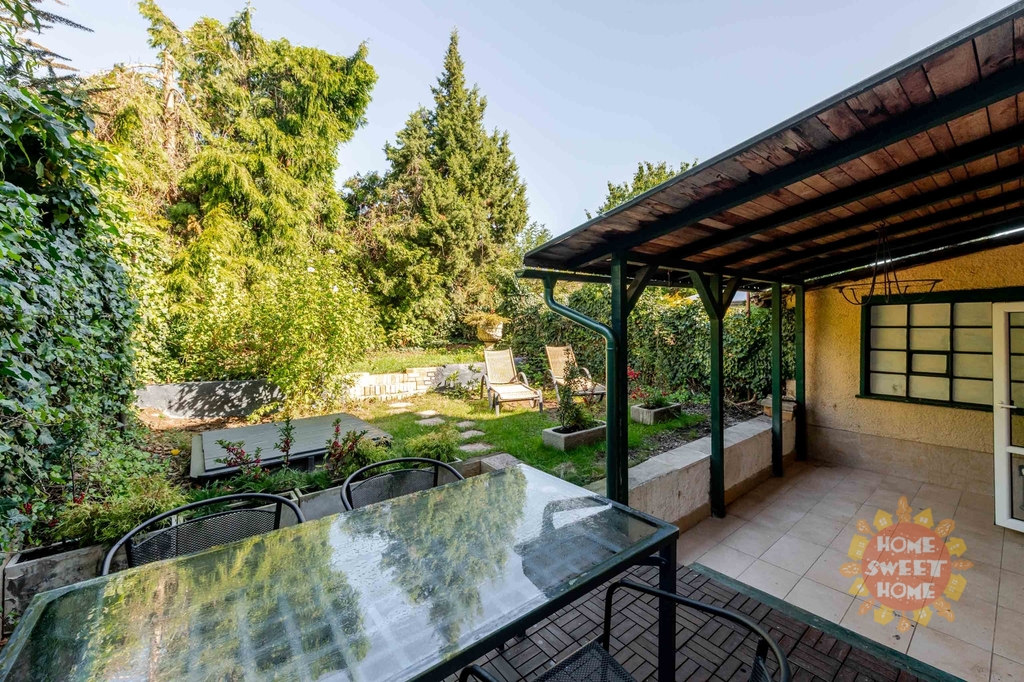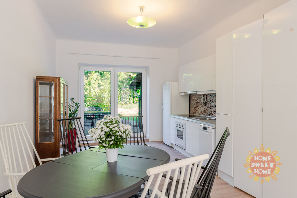 Plně vybavená kuchyně (kombinovaná lednice s mrazákem, sklokeramická varná deska, myčka, elektrická trouba), prostorný obývací pokoj, samostatná toaleta a komora. Z obývací části je přímý vstup na terasu a do udržované zahrady (cca 50 m²) s posezením pod širým nebem i pod zastřešenou pergolou.