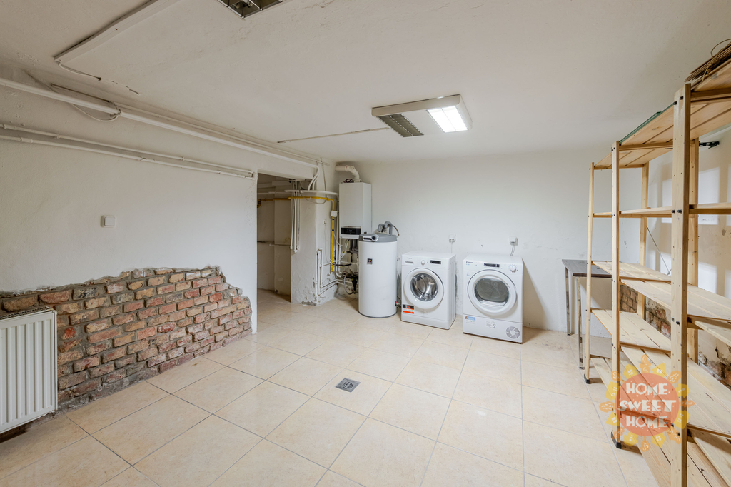 Technická místnost s pračkou, úložný prostor vhodný pro uskladnění potravin, možnost využití jako dílna či vinotéka.