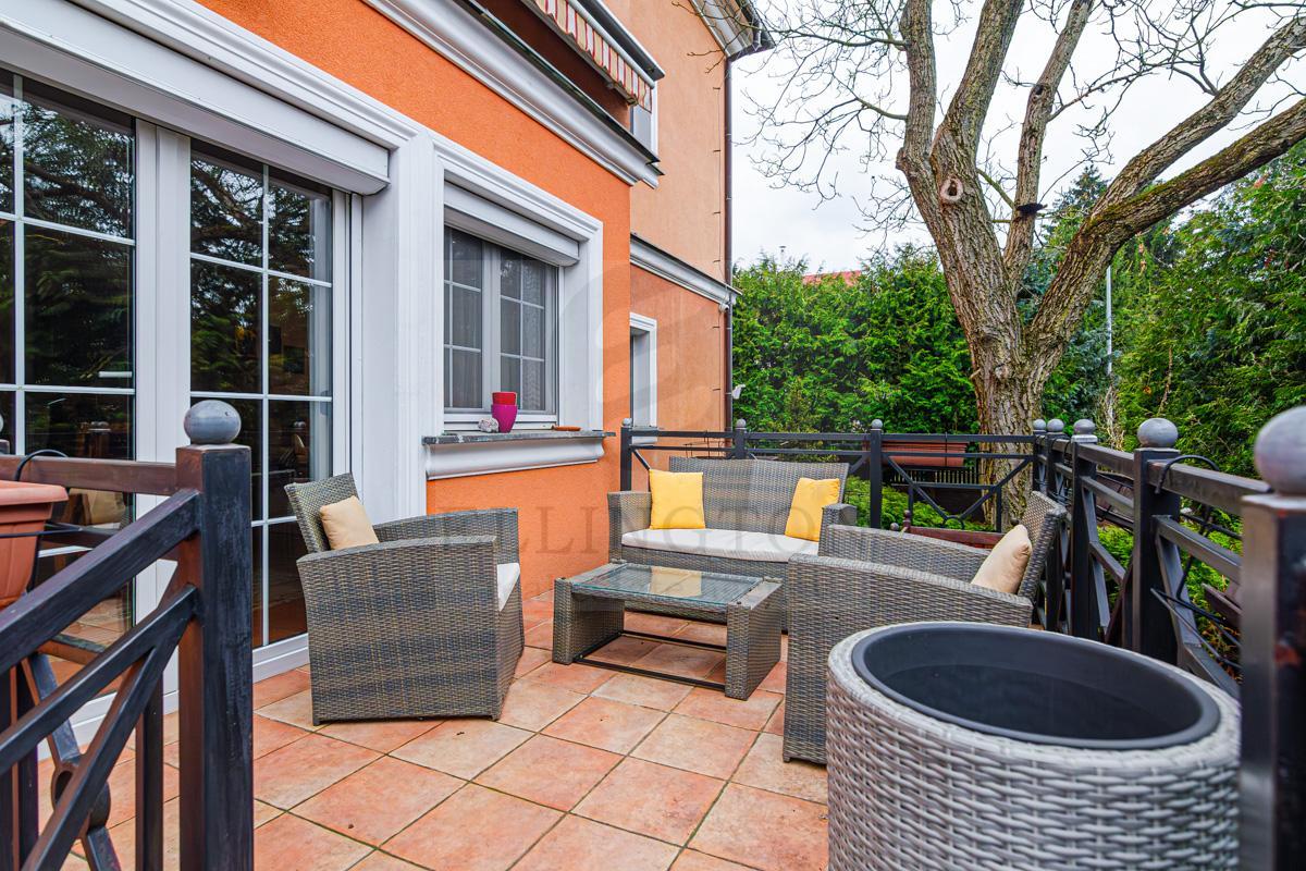 Když budeme pokračovat dále v prohlídce, dostáváme se na menší snídaňovou terasu a z ní můžeme sejít po schodech do krásné vzrostlé zahrady a na druhou terasu. Při firemním i rodinném využití, skýtají terasy a zahrada možnost pracovat i žít venku, v uklidňujícím prostředí.