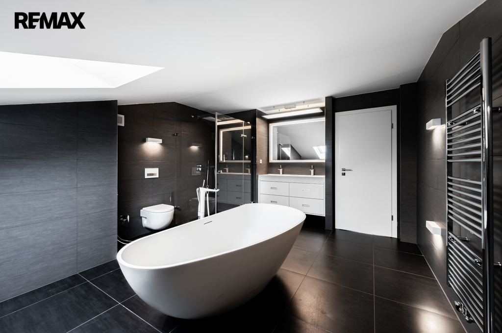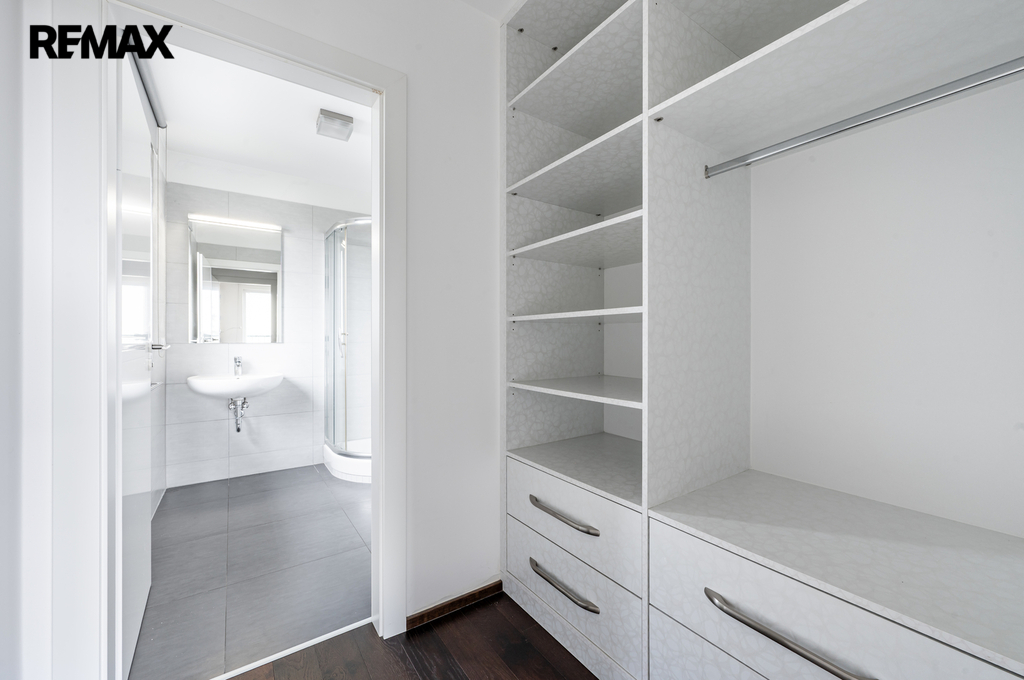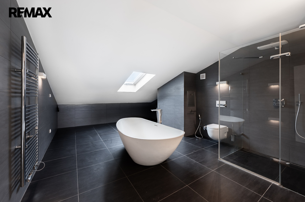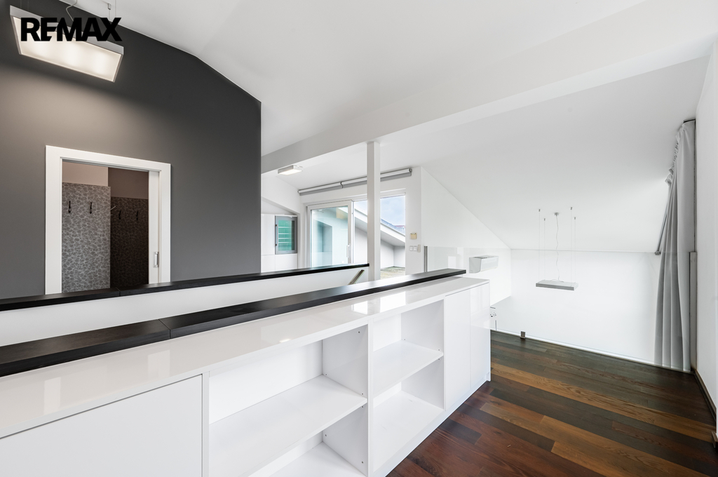 V horním patře je hlavní ložnice s vlastní koupelnou, která je vybavena masážní vanou, sprchovým koutem a toaletou. Součástí této úrovně je galerie navazující na pracovnu a také jižně orientovaná terasa a vestavěné úložné prostory.