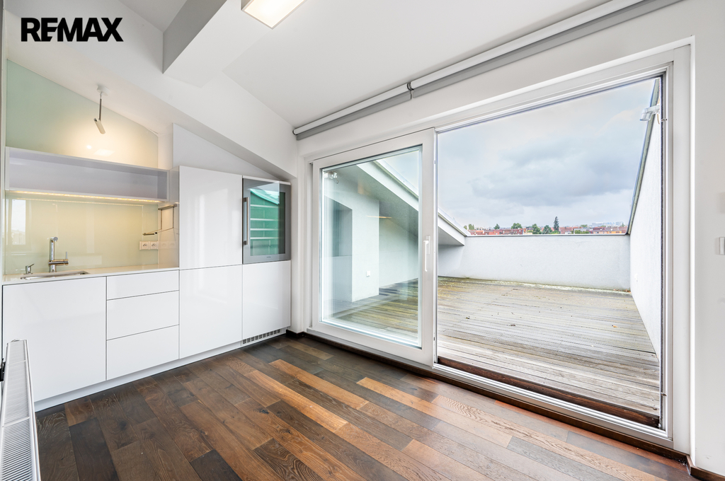 Byt se nachází v nejvyšším, pátém patře bytového domu s výtahem. Od výtahu k bytu vede samostatné schodiště.