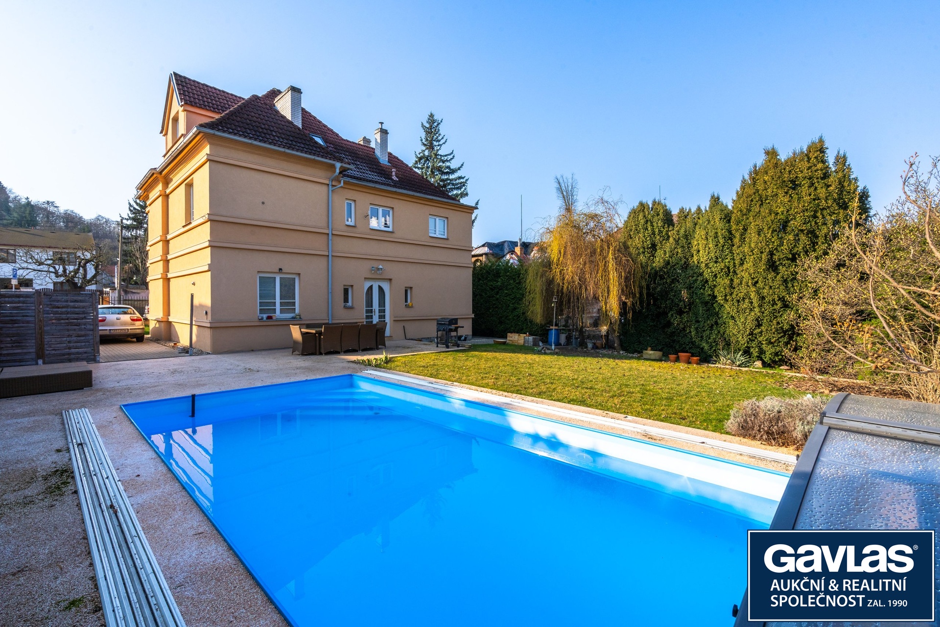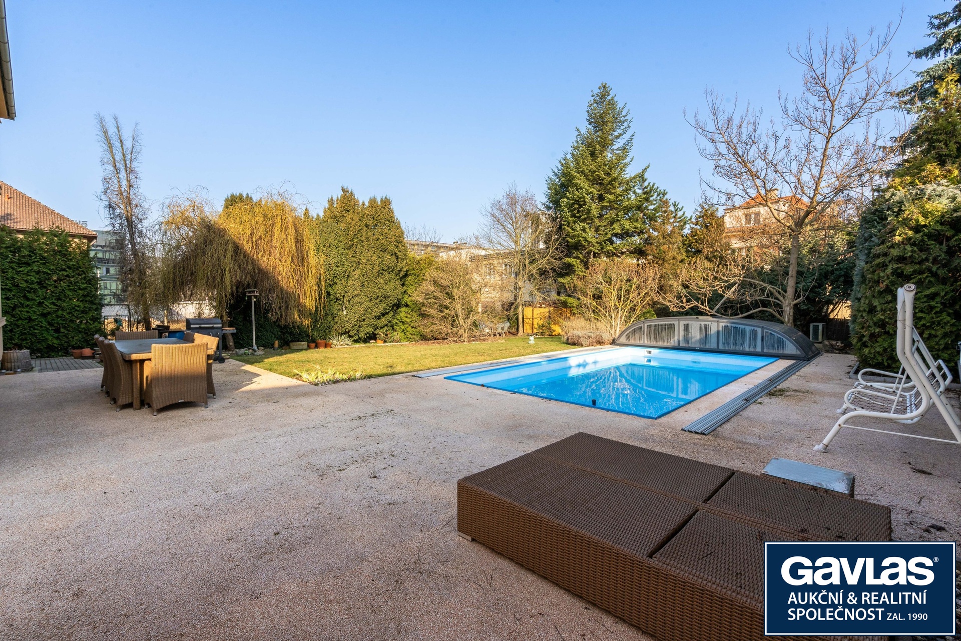 Rozsáhlá zahrada s parkovou úpravou nabízí maximální soukromí i dostatek prostoru pro relaxaci.