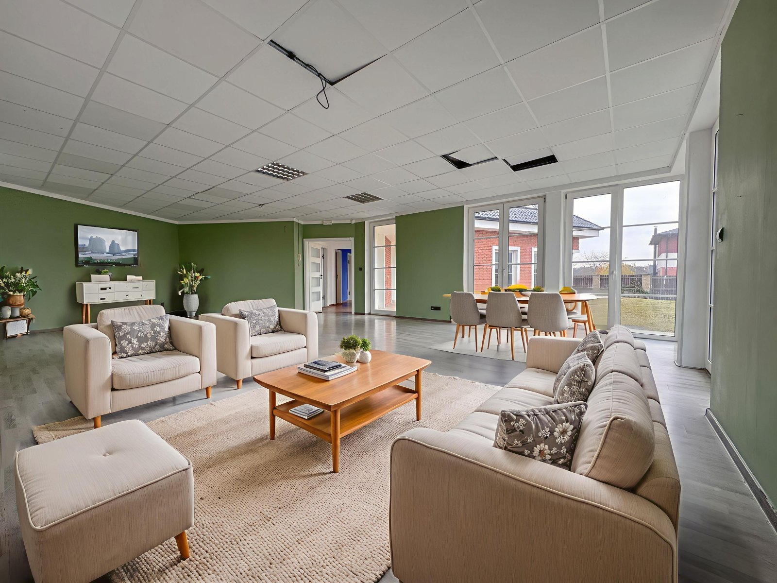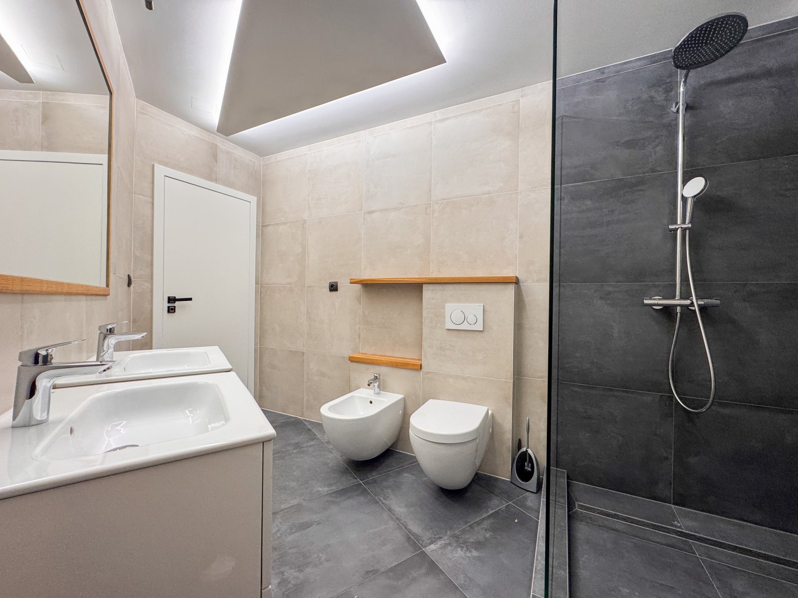 V přízemí domu se nachází vstupní hala a několik velkých místností s francouzskými okny a přímými vstupy na terasu a zahradu. Prostor lze využít jako obývací část, pracovnu, pokoj pro hosty nebo reprezentativní klientské zázemí. Na obytnou část navazuje příprava pro kuchyň s praktickou komorou, moderní koupelna se sprchovým koutem, toaletou a bidetem, technická místnost a prostorná dvougaráž s elektrickými vraty a vstupem přímo do domu. Díky otevřeným plochám je možné přízemí snadno přizpůsobit konkrétním potřebám – rodinnému provozu, kancelářím, studiu, showroomu či službám.