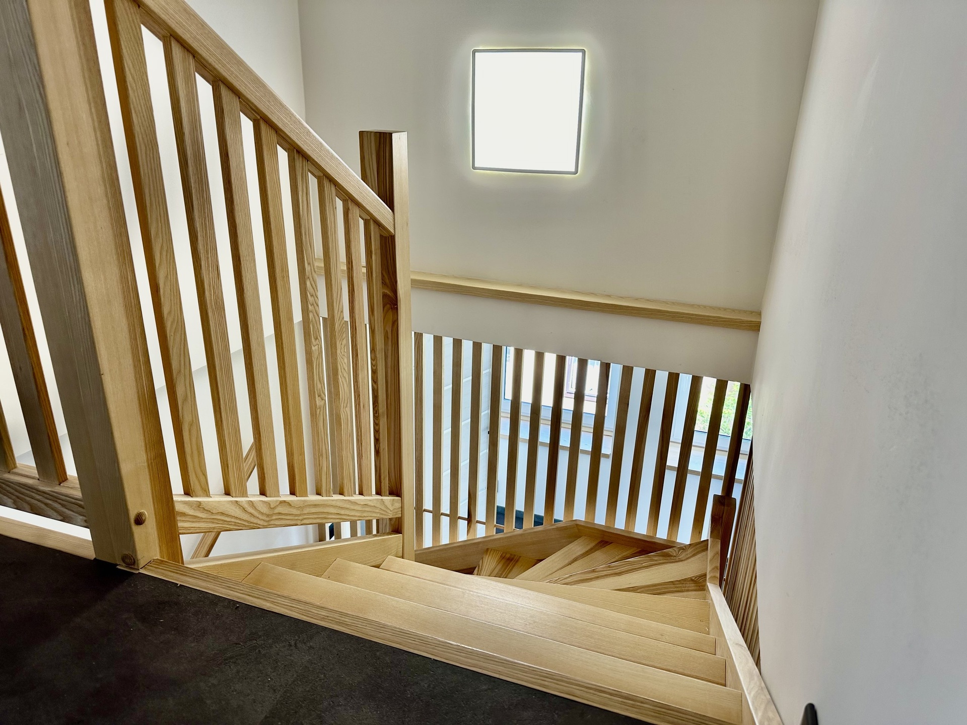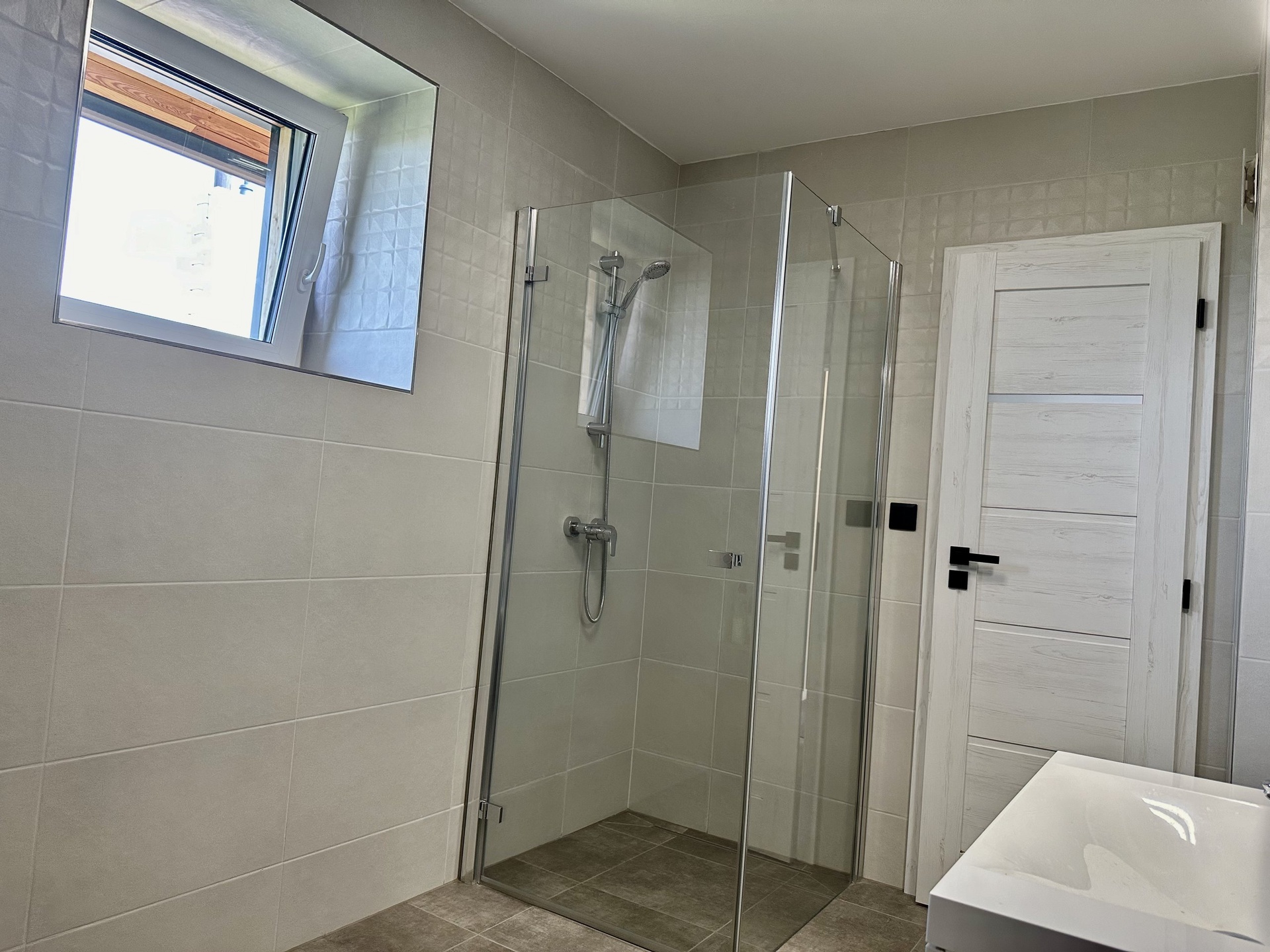 V podkroví jsou další dva pokoje 10 a 20m² koupelna se sprchovým koutem a toaletou. Do podkrovního patra je přístup po bezpečném, dostatečně prostorném dřevěném schodišti.