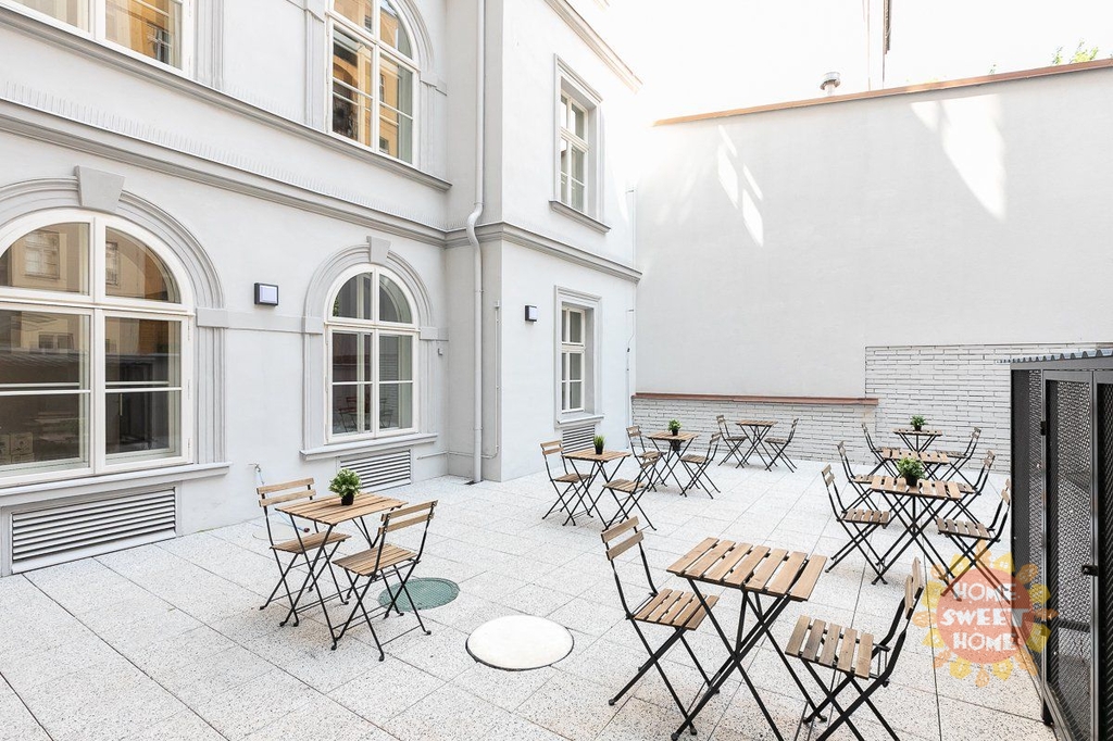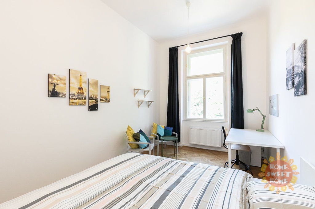 Krásný, zařízený pokoj 18m² se společnou, zařízenou kuchyní s jídelním koutem, koupelnou se sprchou a toaletou se nachází v Residenci Kinských v 1. patře cihlového domu v ulici nám.Kinských, Praha 5. Dům prošel kompletní rekonstrukcí roku 2019. Pokoj i byt je kompletně zařízený, včetně žehličky, prkna a vybavení na úklid. V pokoji je manželská postel. Nachází se v 4 pokojovém bytě s 2 koupelnami a extra toaletou. Úklid společných prostor je již zahrnut v ceně nájmu, a to jednou týdně. Dále je také k dispozici zcela zdarma fitness, prádelna (na mince) a společná terasa.