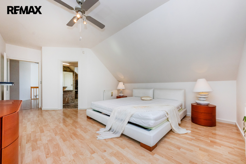 Patro nabízí tři prostorné ložnice, navazující dvě šatny a vstup na balkon orientovaný do zahrady. Jedna z nich má vlastní koupelnu s toaletou. Další koupelna s toaletou je přístupná z centrální předsíně.