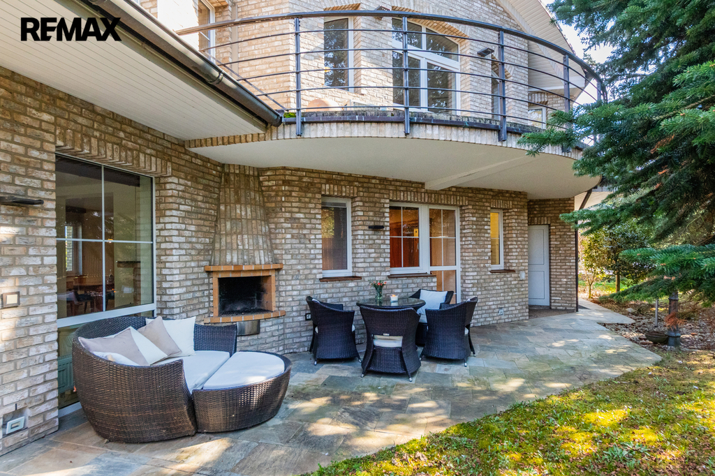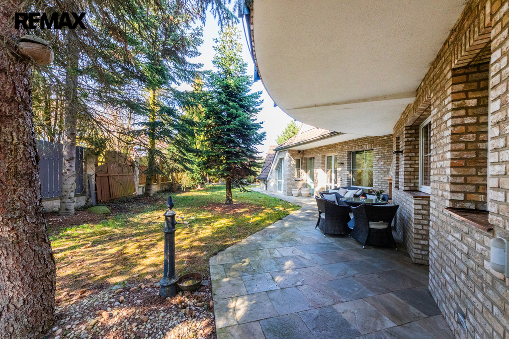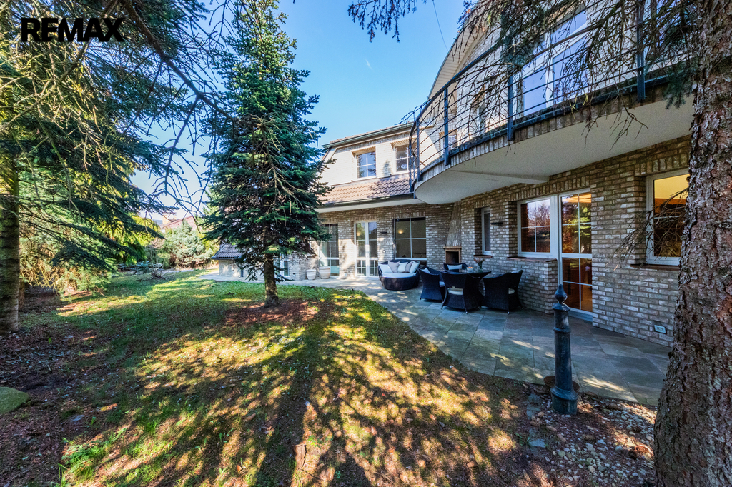 Součástí vzrostlé zahrady je okrasné jezírko, venkovní posezení s krbem a vířivka. Údržbu zajišťuje robotická sekačka a zavlažovací systém.