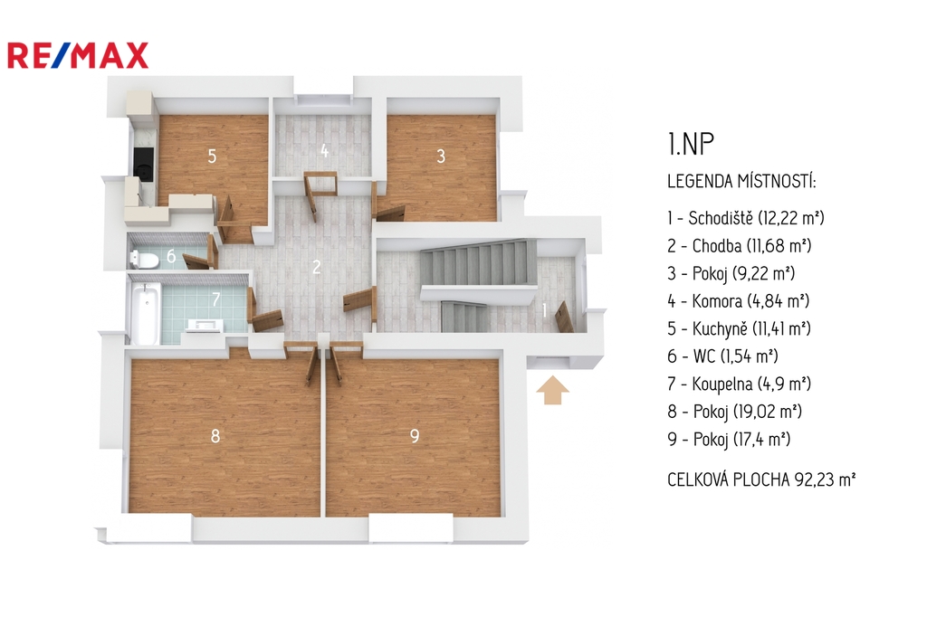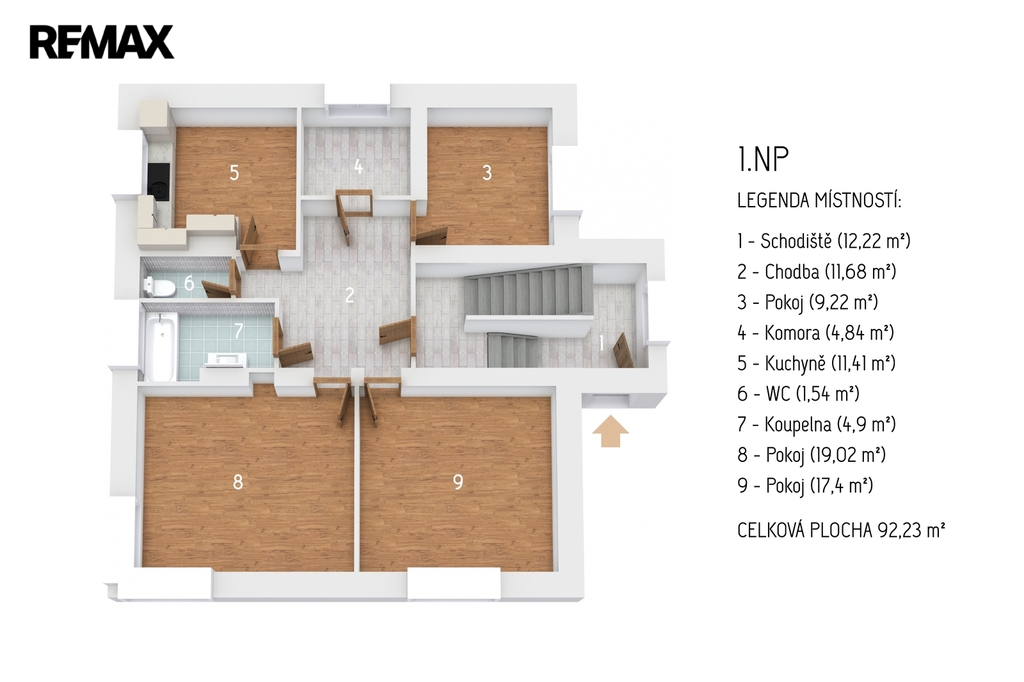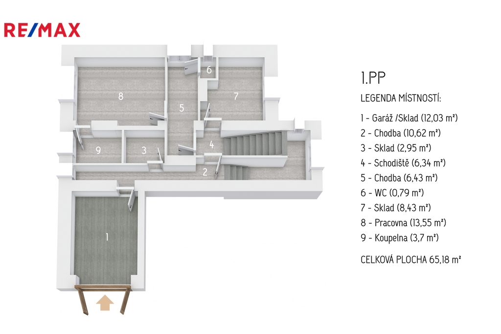 1. PP – 1+kk + sklad, sklep, garáž, 65,00 m²