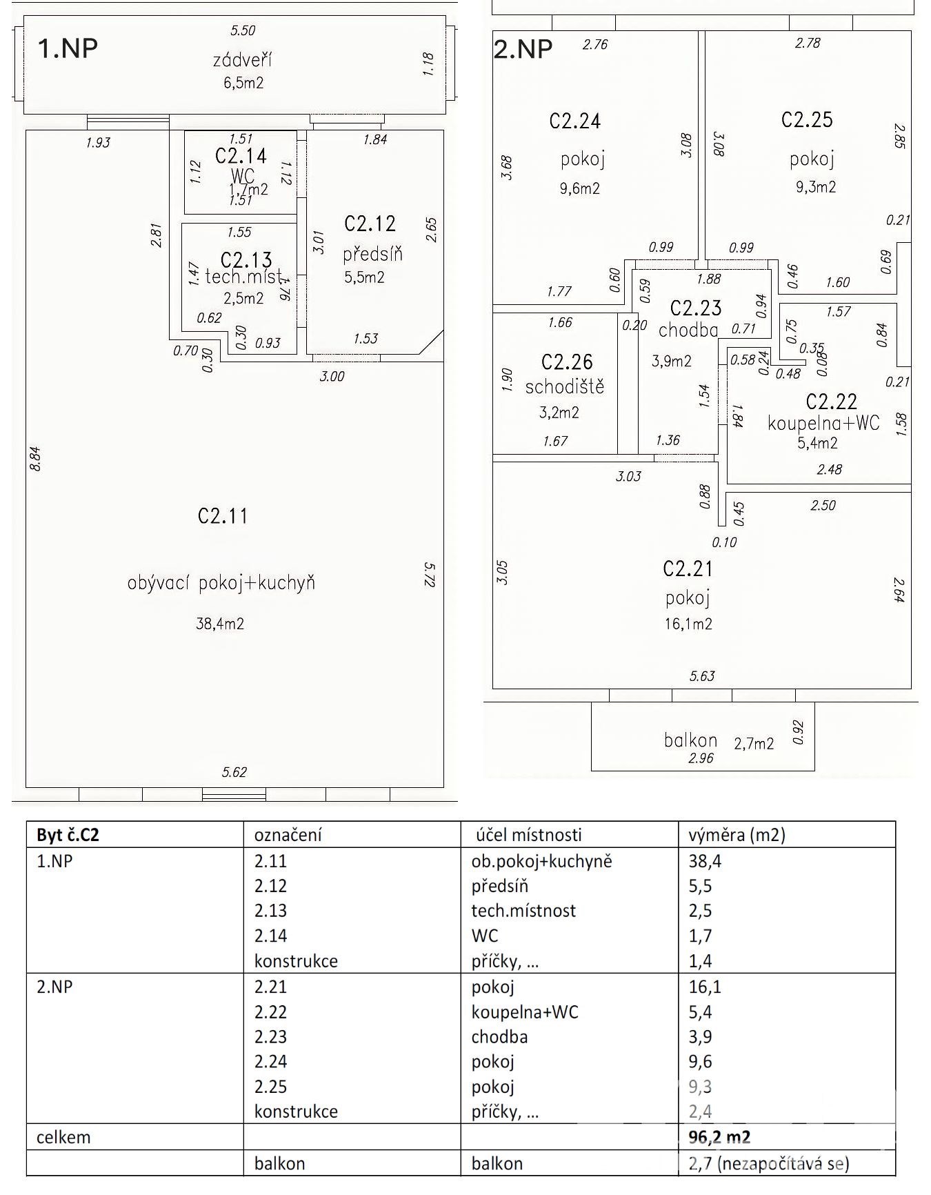 2. NP: V patře se nachází tři samostatné ložnice (16 m², 9,6 m², 9,3 m²) a koupelna. Hlavní ložnice nabízí dostatek prostoru. Z hlavní ložnice je vstup na balkon (2,7 m²) s krásným výhledem do údolí a do města.