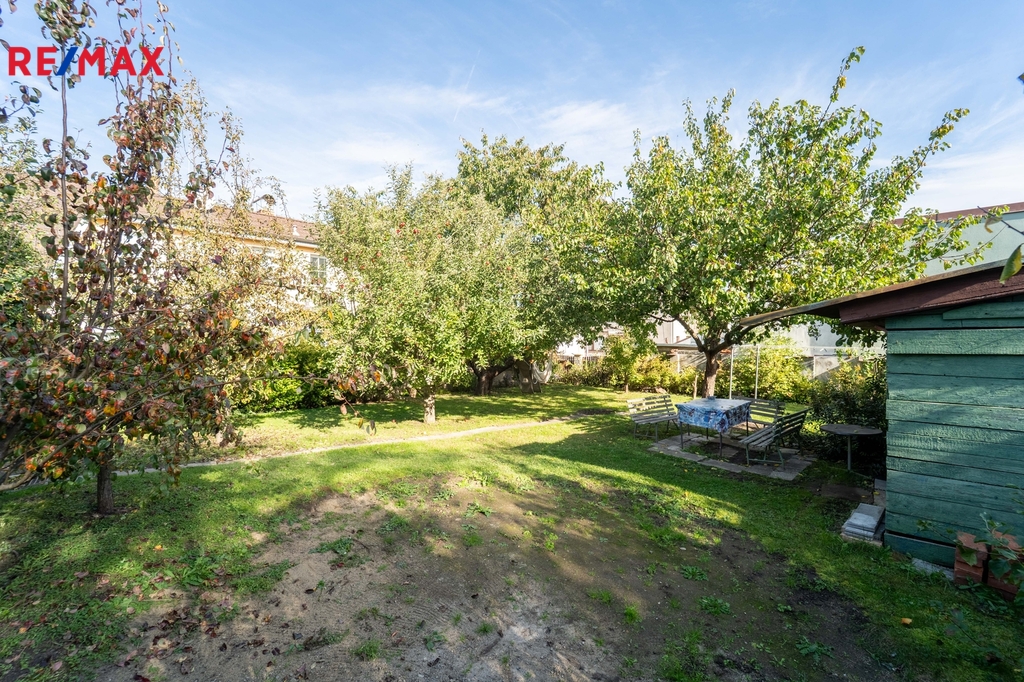 Zahrada u domu o velikosti 303 m2 poskytuje klid a útočiště s posezením pod ovocnými stromy vedle zahradního domku, díky němuž máte kam uklidit vše potřebné pro její údržbu.
