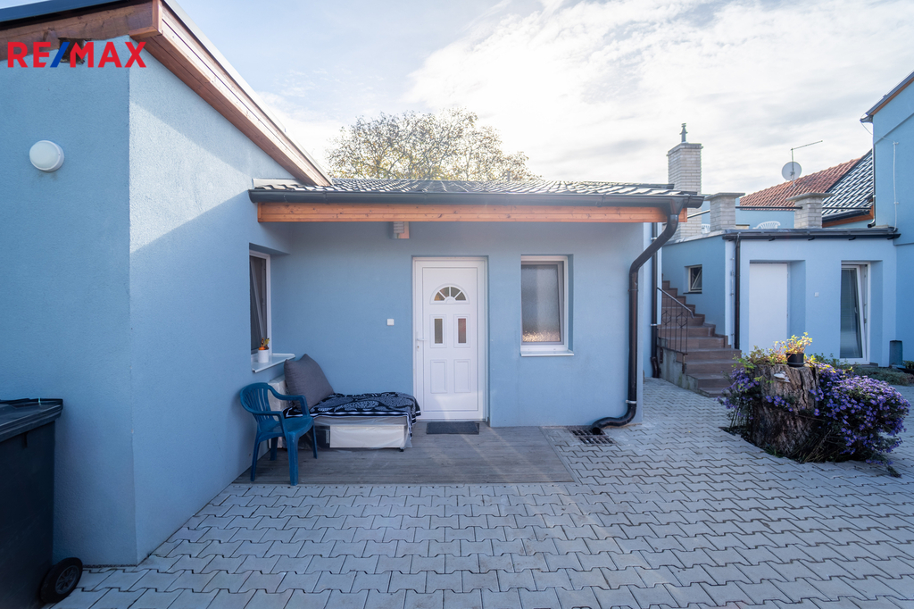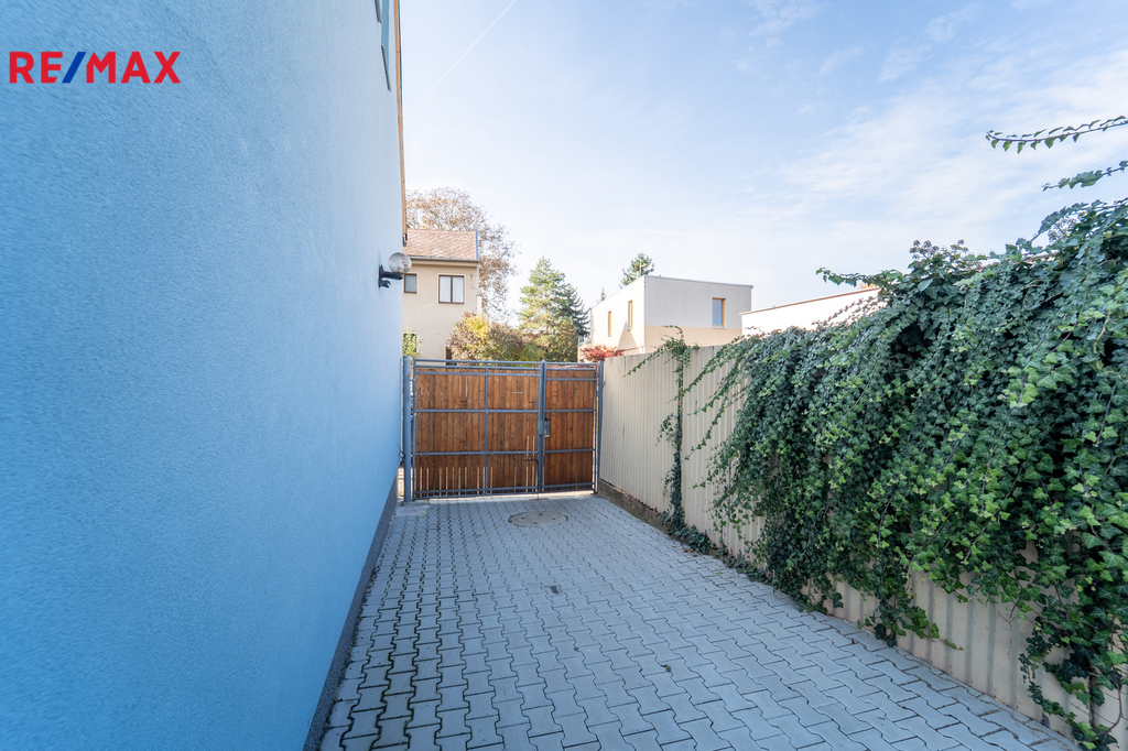 Zastavěná plocha a nádvoří domu o velikosti 358 m2 je osazeno zámkovou dlažbou a umožňuje vjezd na pozemek přímo z ulice Legionářů