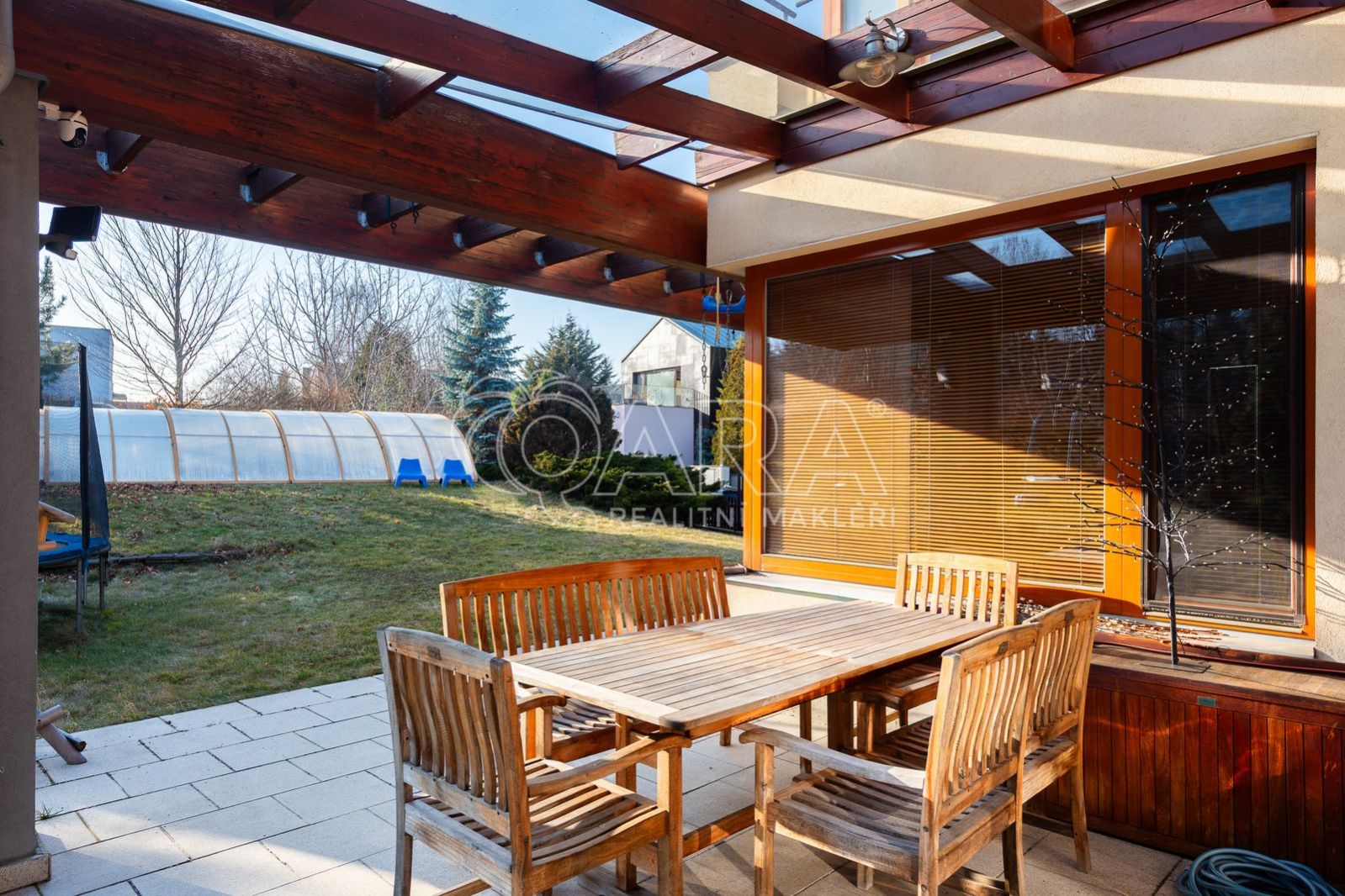 Zahrada je snadno udržovatelná se vzrostlou zelení a nachází se zde vyhřívaný a zastřešený bazén se slanou vodou a protiproudem.