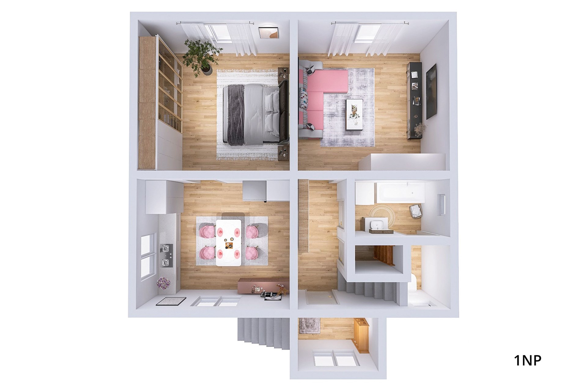 Dispozice domu je 4+1. V každém podlaží se nachází samostatná koupelna s toaletou. V přízemí je k dispozici kuchyň, ve 2. podlaží je pak připravena možnost vybudování druhé kuchyňské linky, což umožňuje pohodlně oddělit bydlení pro dvě generace. Dostatek úložného místa zajišťuje podkrovní prostor, sklep i prostorná dílna. Parkovat lze na dvoře nebo před domem.