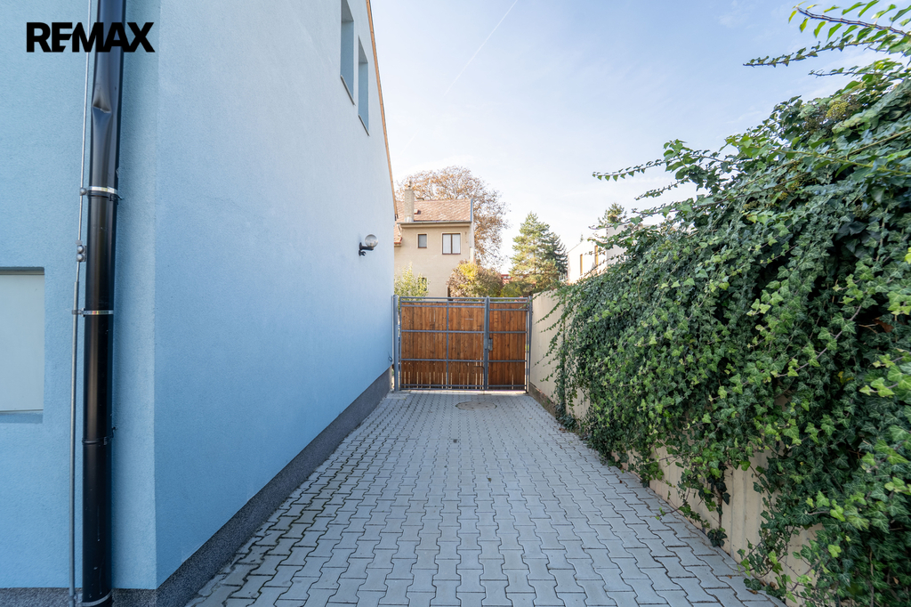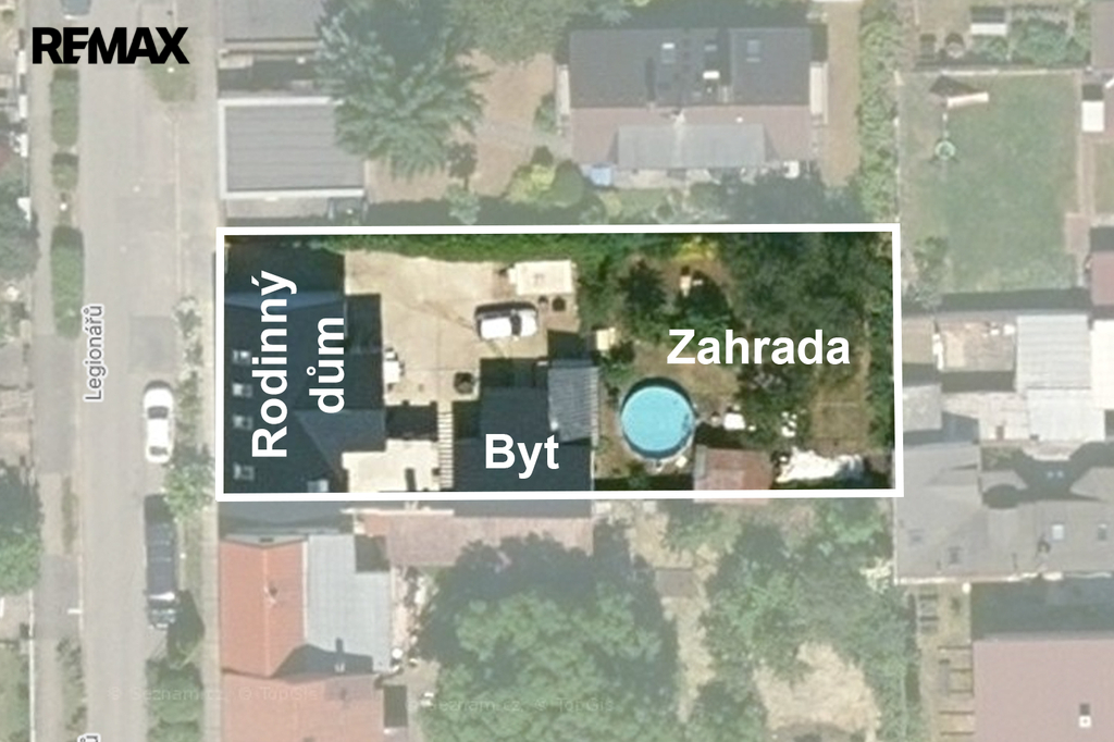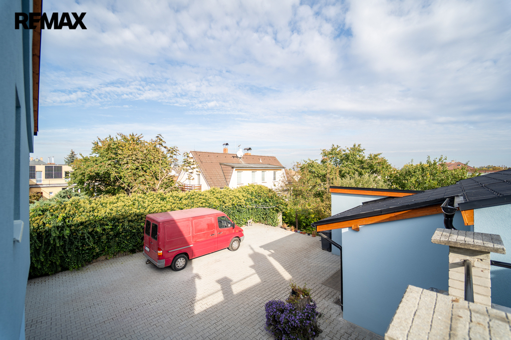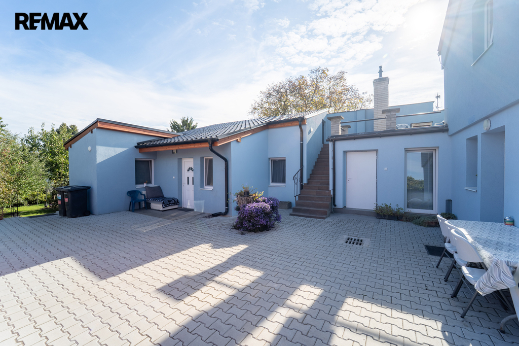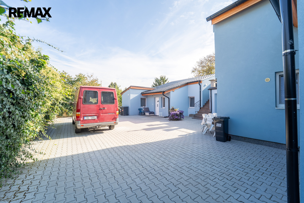 Zastavěná plocha a nádvoří domu o velikosti 358 m2 je osazeno zámkovou dlažbou a umožňuje vjezd na pozemek přímo z ulice Legionářů
