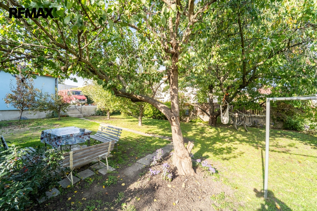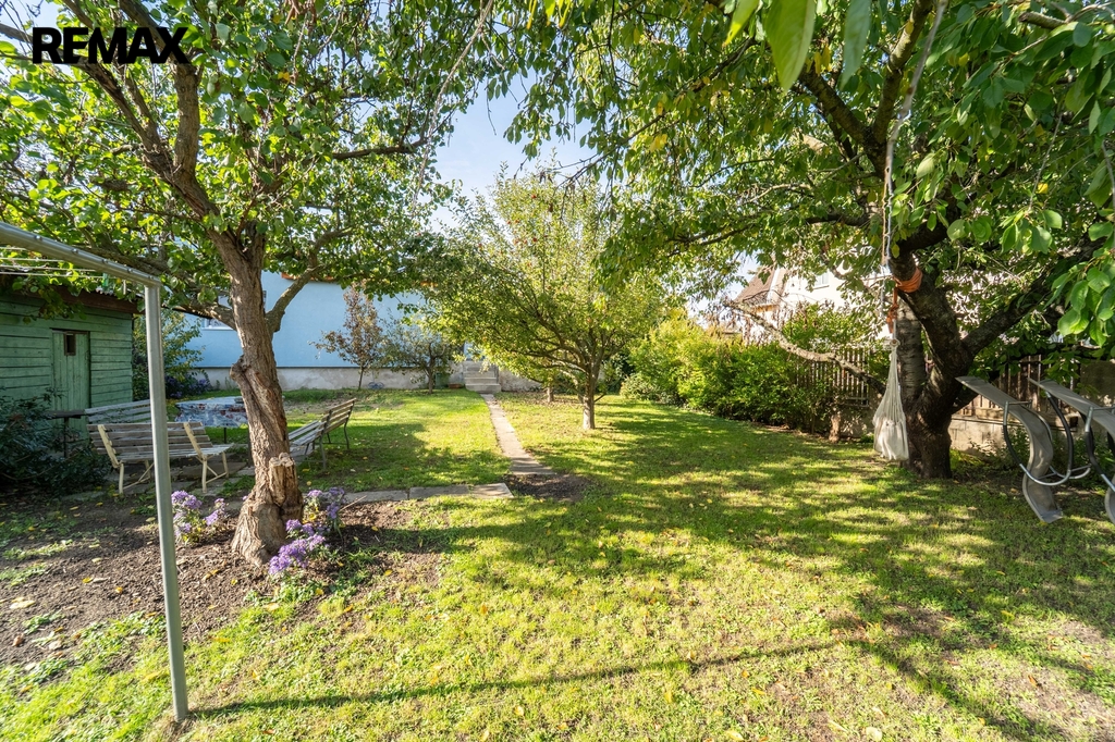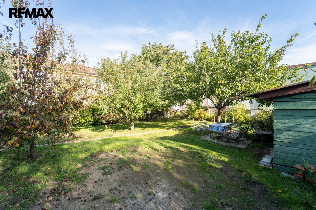 Zahrada u domu o velikosti 303 m2 poskytuje klid a útočiště s posezením pod ovocnými stromy vedle zahradního domku.