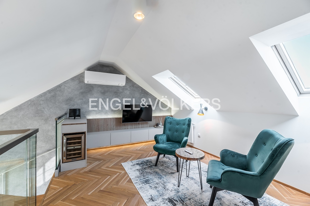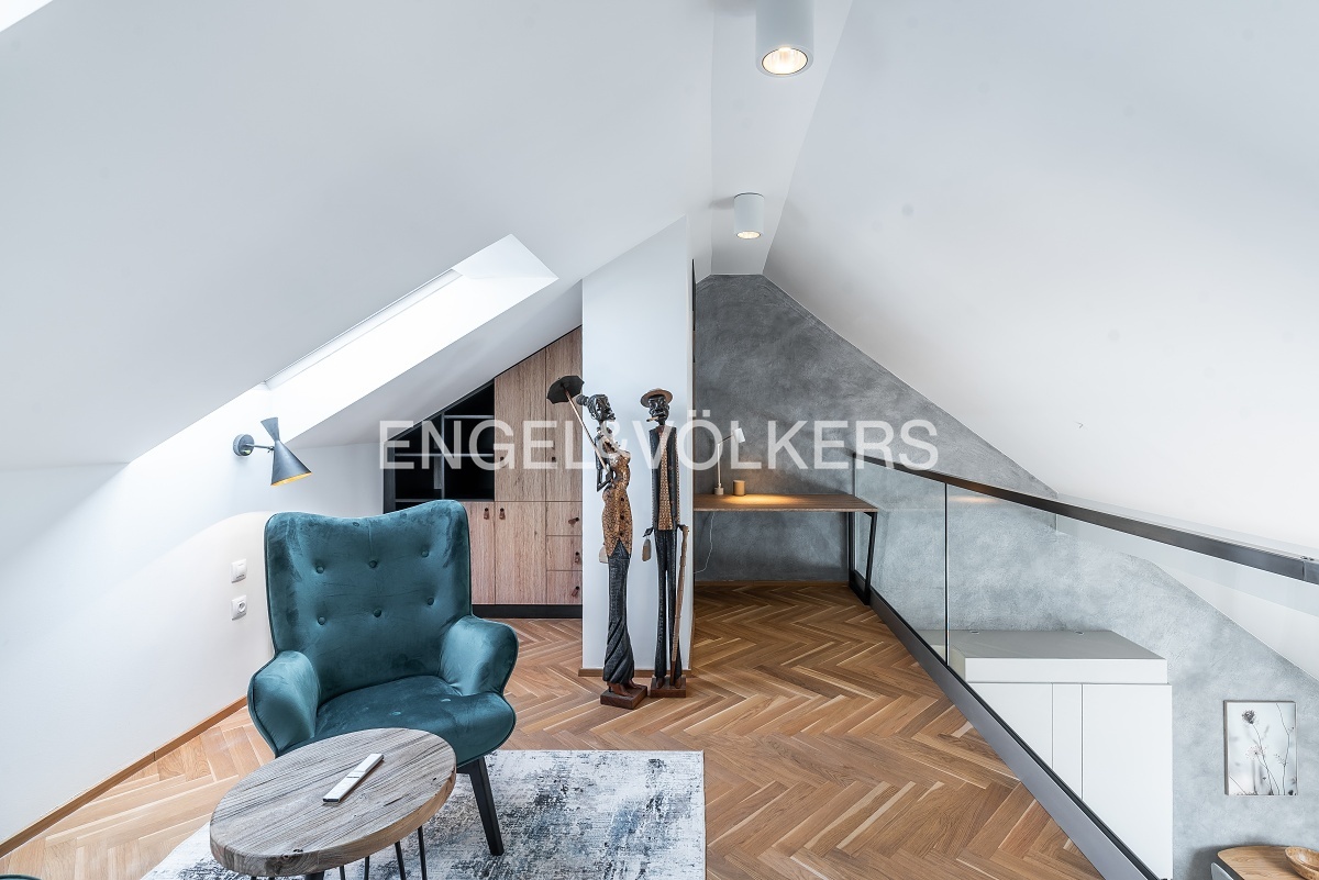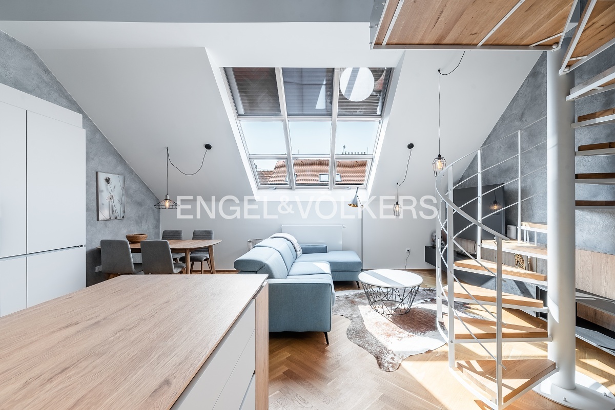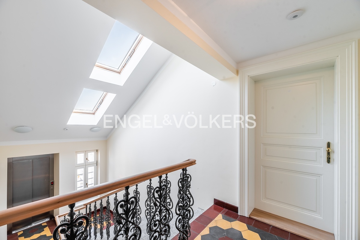 Byt prošel náročnou kompletní rekonstrukcí a nabízí se kompletně vybavený nábytkem na míru. Vstupní chodba disponuje vestavěnými skříněmi a vede do světlého obývacího pokoje s kuchyňským koutem. Kuchyně je kompletně vybavena spotřebiči značky Miele (včetně kombinované pračky se sušičkou). Obývací pokoj je nádherně světlý díky velkému střešnímu oknu a je propojen s galerií v horním patře. Galerie poskytuje příjemný prostor pro pracovnu a disponuje také vinotékou. V bytě jsou dvě ložnice, z nichž je jedna vybavena designovým nábytkem. K dispozici jsou dvě koupelny, jedna s vanou a druhá se sprchovým koutem. V bytě je nainstalována klimatizace. Další velkou výhodou bytu je jedno parkovací stání ve vnitrobloku domu. Součástí pronájmu je i sklep v podzemním podlaží.