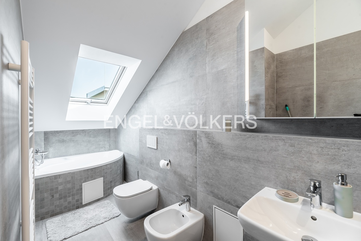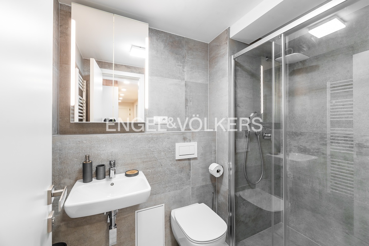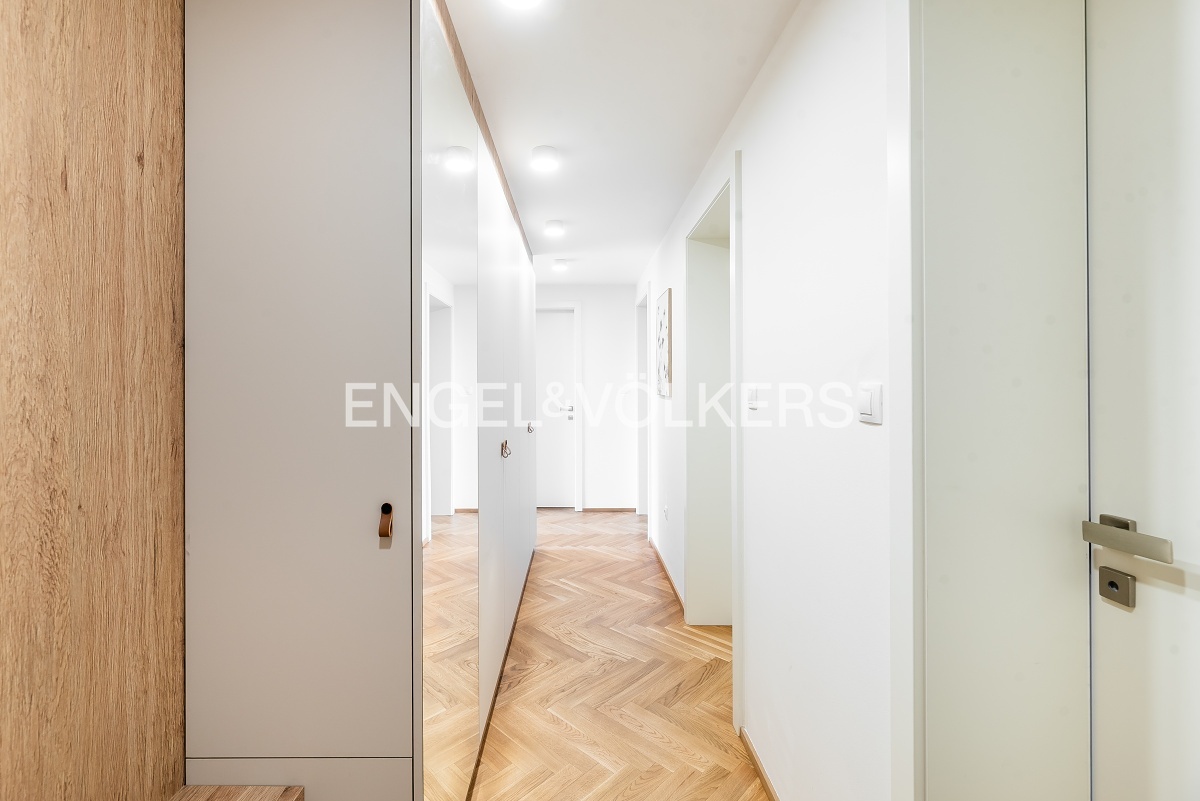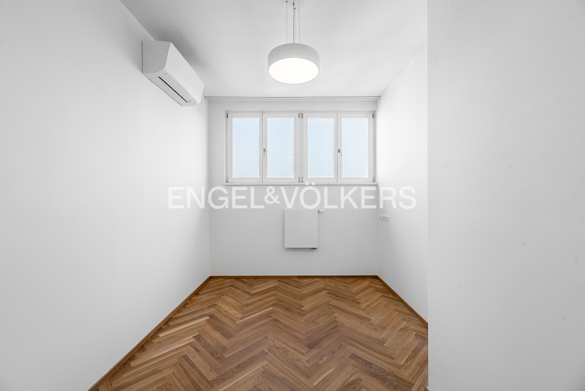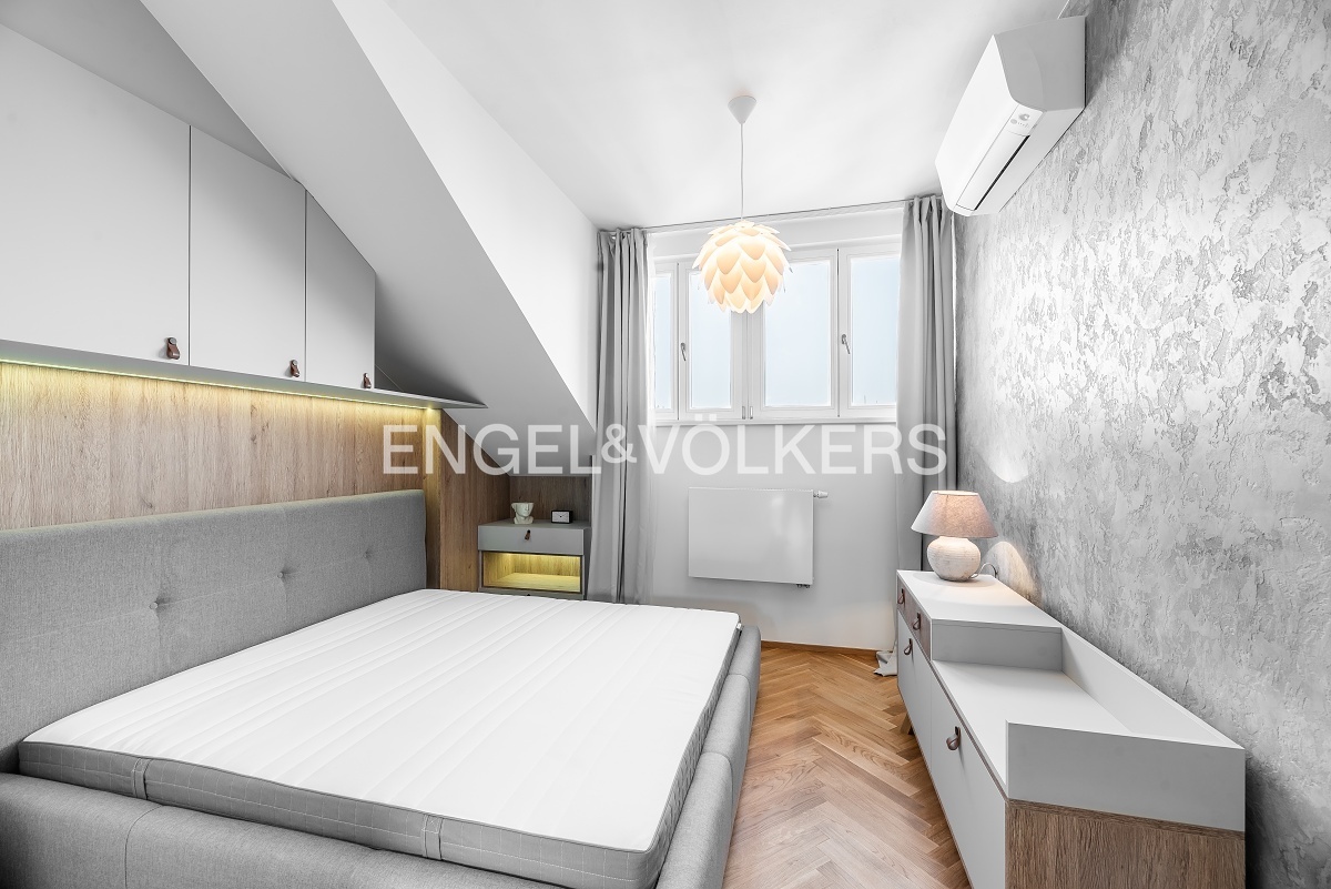 Byt prošel náročnou kompletní rekonstrukcí a nabízí se kompletně vybavený nábytkem na míru. Vstupní chodba disponuje vestavěnými skříněmi a vede do světlého obývacího pokoje s kuchyňským koutem. Kuchyně je kompletně vybavena spotřebiči značky Miele (včetně kombinované pračky se sušičkou). Obývací pokoj je nádherně světlý díky velkému střešnímu oknu a je propojen s galerií v horním patře. Galerie poskytuje příjemný prostor pro pracovnu a disponuje také vinotékou. V bytě jsou dvě ložnice, z nichž je jedna vybavena designovým nábytkem. K dispozici jsou dvě koupelny, jedna s vanou a druhá se sprchovým koutem. V bytě je nainstalována klimatizace. Další velkou výhodou bytu je jedno parkovací stání ve vnitrobloku domu. Součástí pronájmu je i sklep v podzemním podlaží.