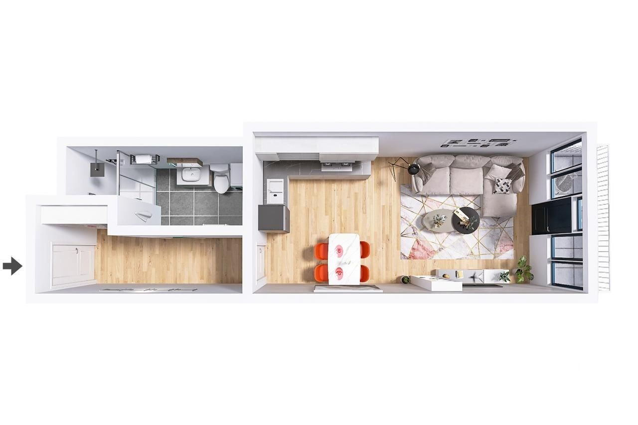 Poznámka: Byt se prodává nevybavený. Vizualizace představují jednu z možností designového stylu vybavení bytu.