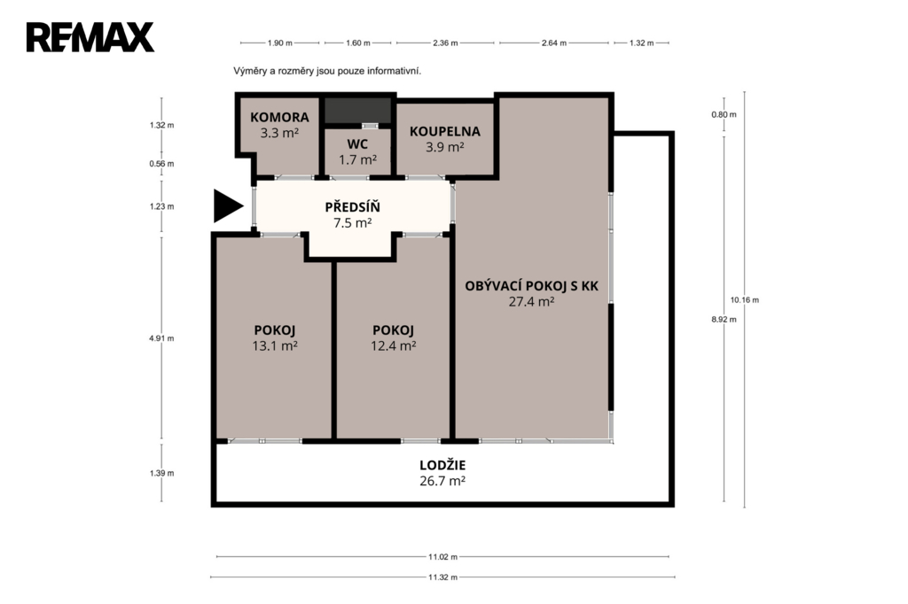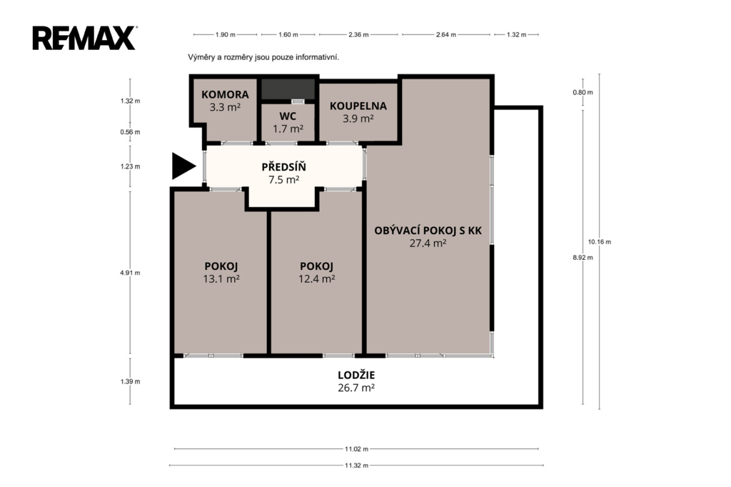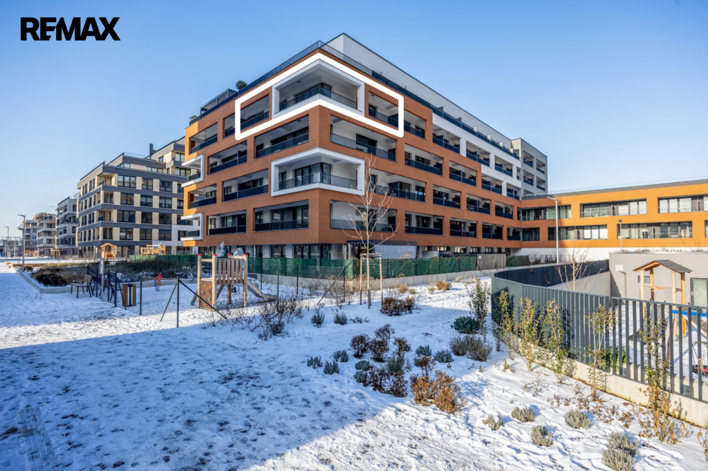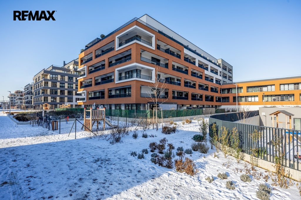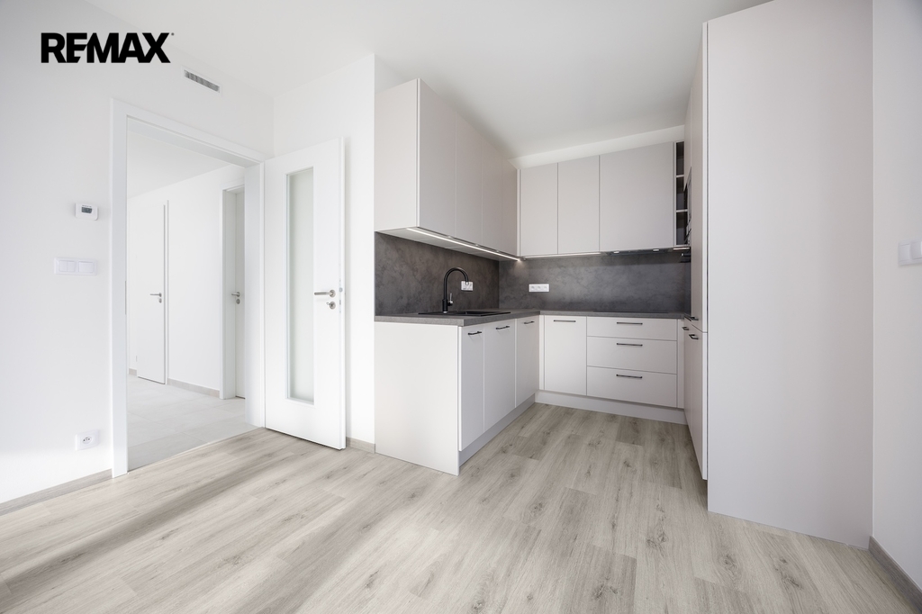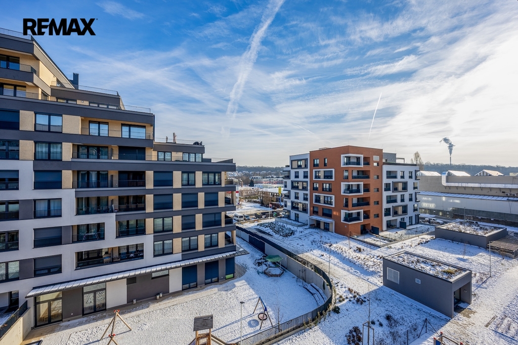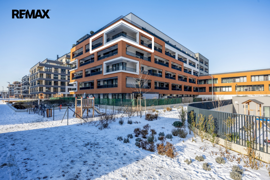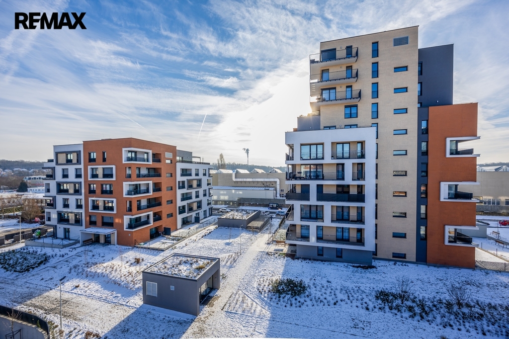 Dispozice: obývací pokoj s kuchyňským koutem (27,4 m²), dva pokoje (13,1 m² a 12,4 m²), koupelna (3,9 m²), samostatné WC (1,7 m²), předsíň (7,5 m²) a komora (3,3 m²). Kuchyňská linka je vybavena vestavěnými spotřebiči, okna mají izolační trojskla. Vytápění řeší podlahové konvektory, přísun čerstvého vzduchu rekuperace. Díky moderním technologiím tak nabízí byt maximální komfort a nízké měsíční náklady.