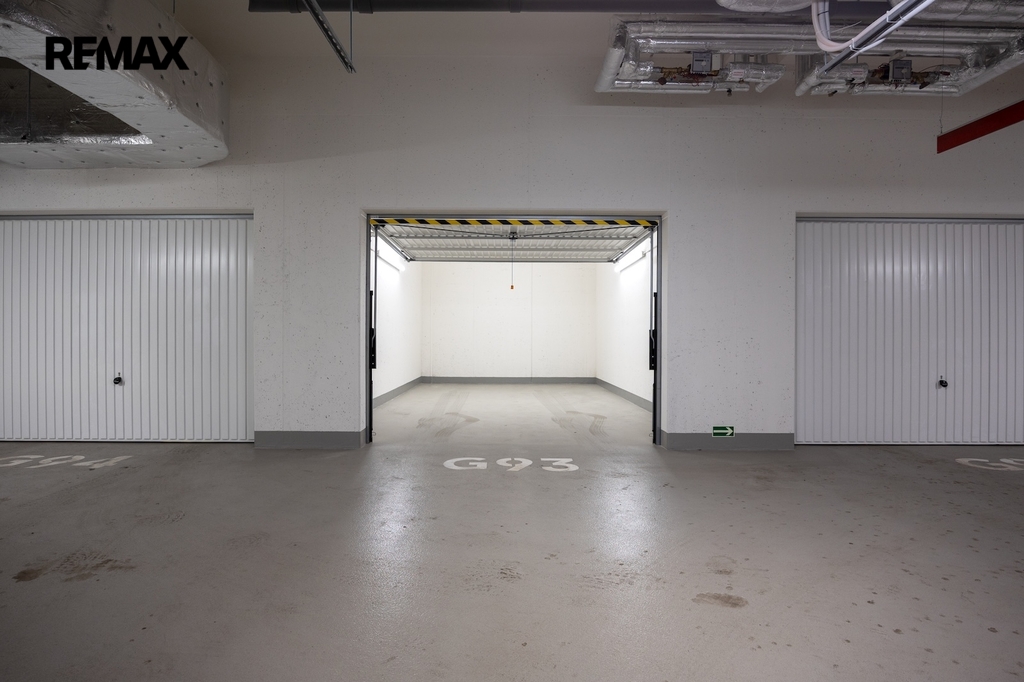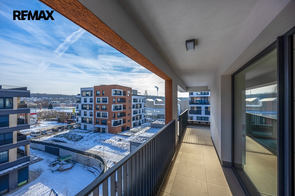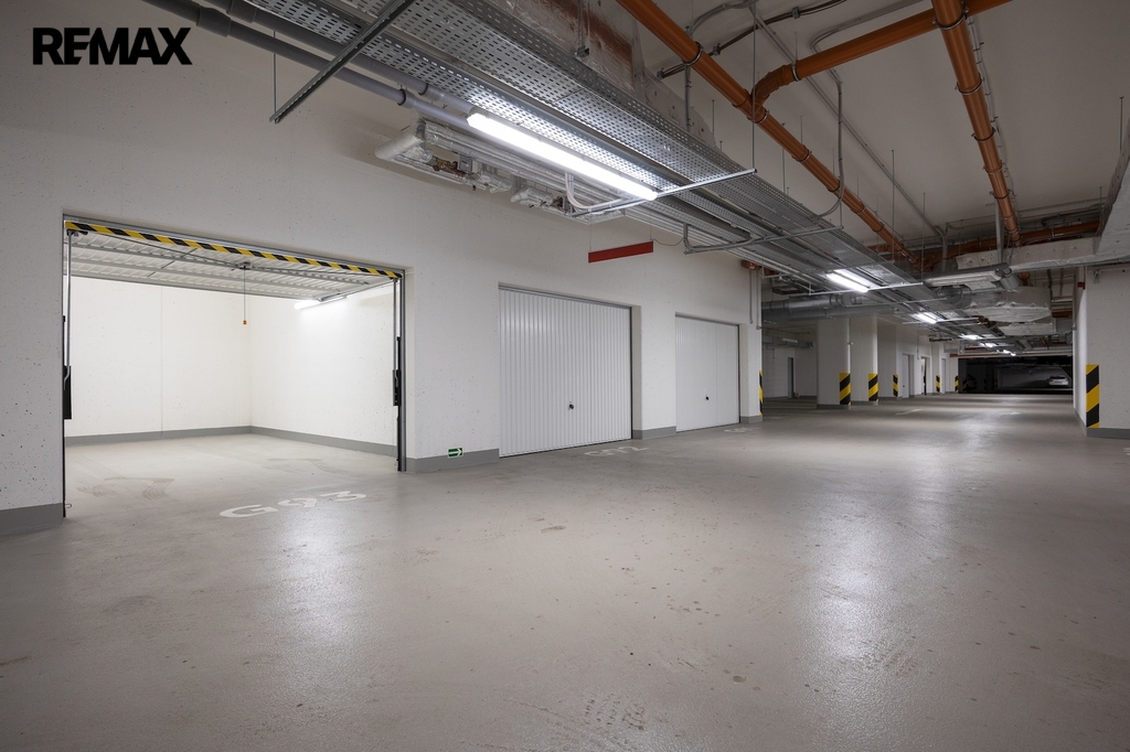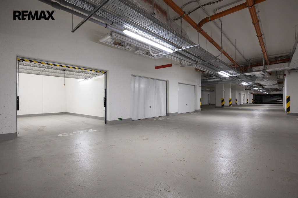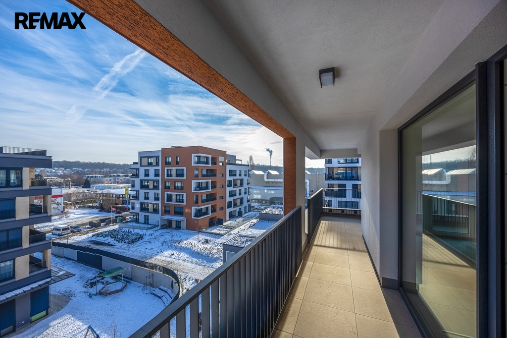 Lodžie o velikosti 26,7 m² je orientovaná na jih a východ, s výhledem do klidného vnitrobloku. Lodžie je přístupná ze všech tří pokojů. K bytu náleží uzavíratelná garáž a sklep v prvním podzemním podlaží. Dále v domě naleznete společnou kočárkárnu.