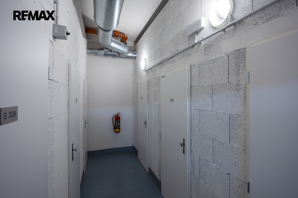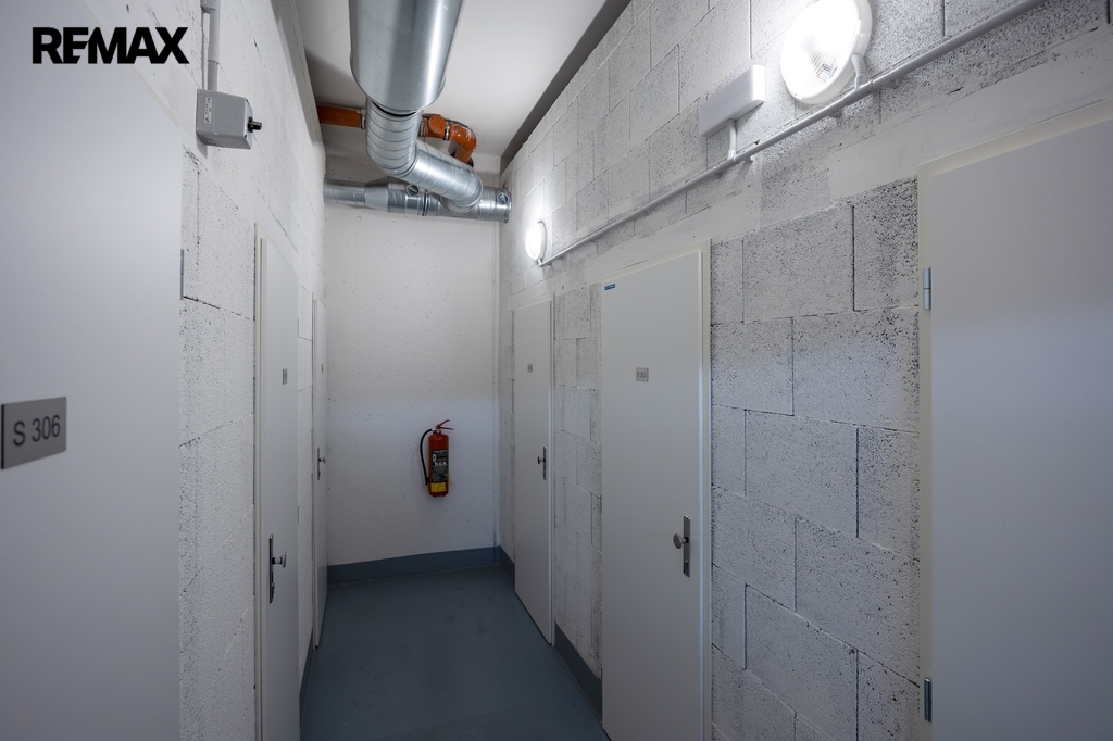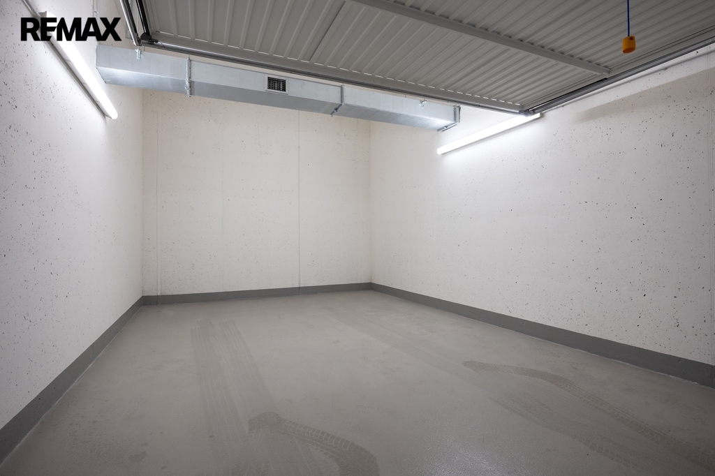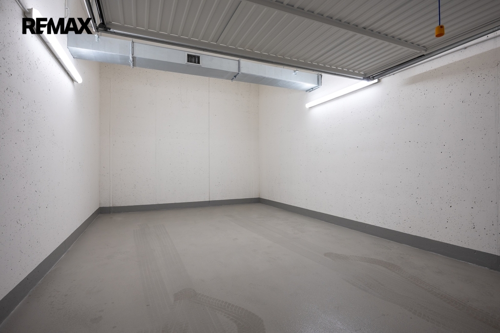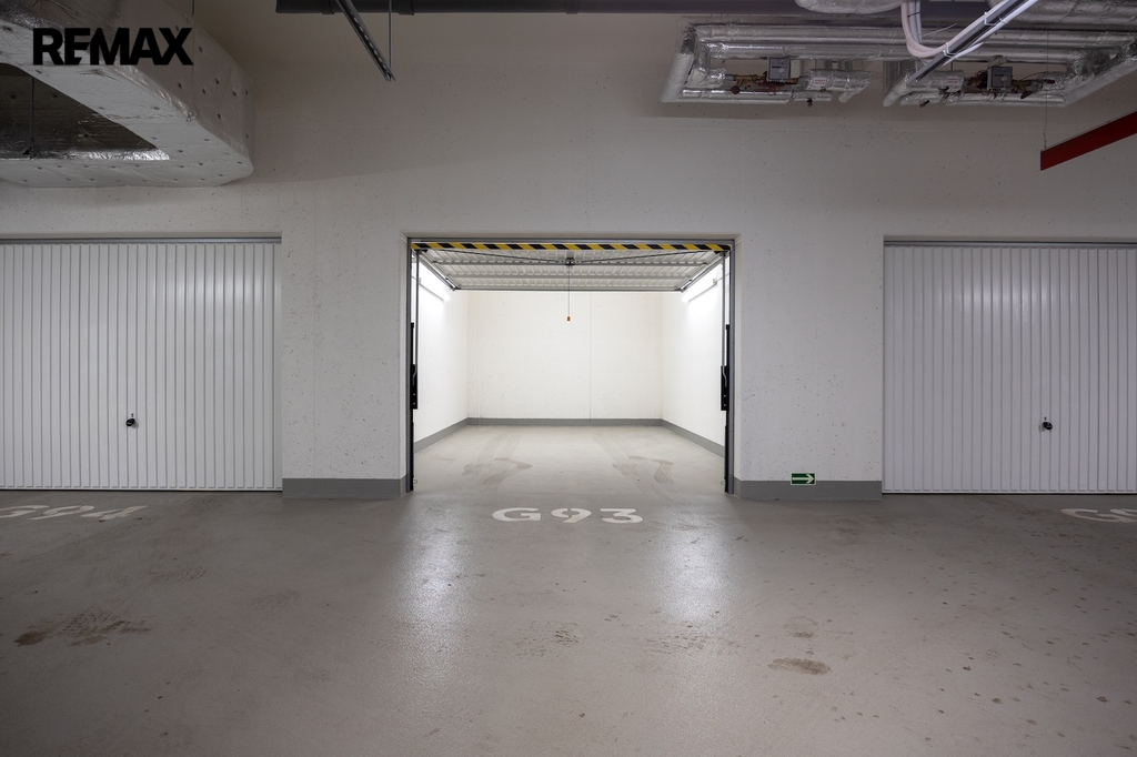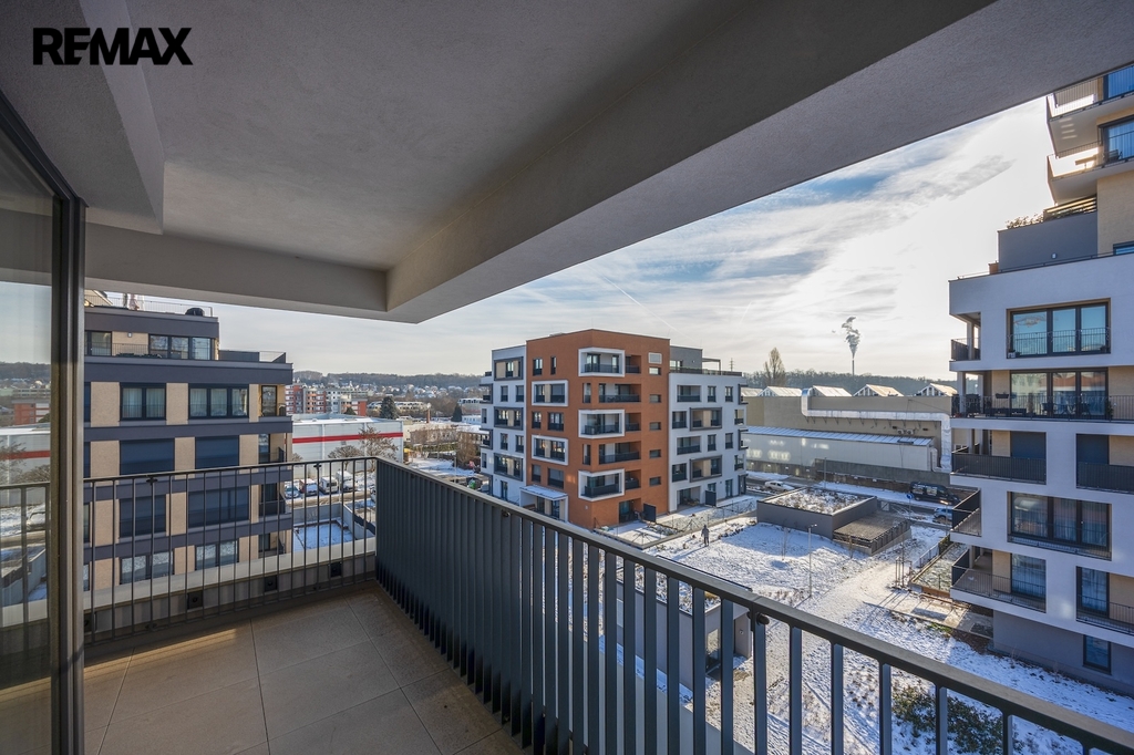 Lodžie o velikosti 26,7 m² je orientovaná na jih a východ, s výhledem do klidného vnitrobloku. Lodžie je přístupná ze všech tří pokojů. K bytu náleží uzavíratelná garáž a sklep v prvním podzemním podlaží. Dále v domě naleznete společnou kočárkárnu.
