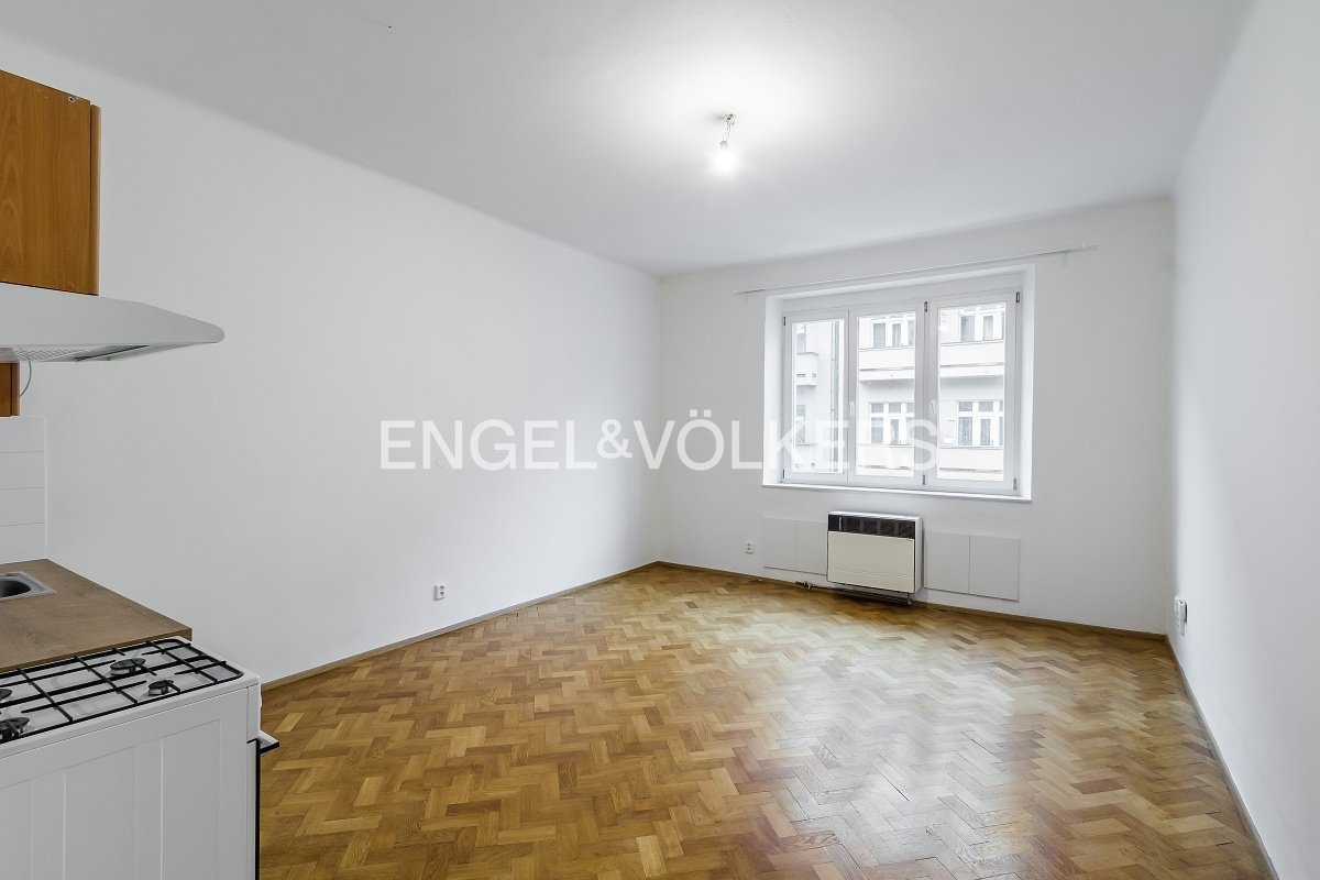 K pronájmu nabízíme světlý byt 1+kk o velikosti 35 m2, umístěný ve 4. nadzemním podlaží udržovaného činžovního domu s výtahem ve vyhledávané rezidenční lokalitě Vršovic.