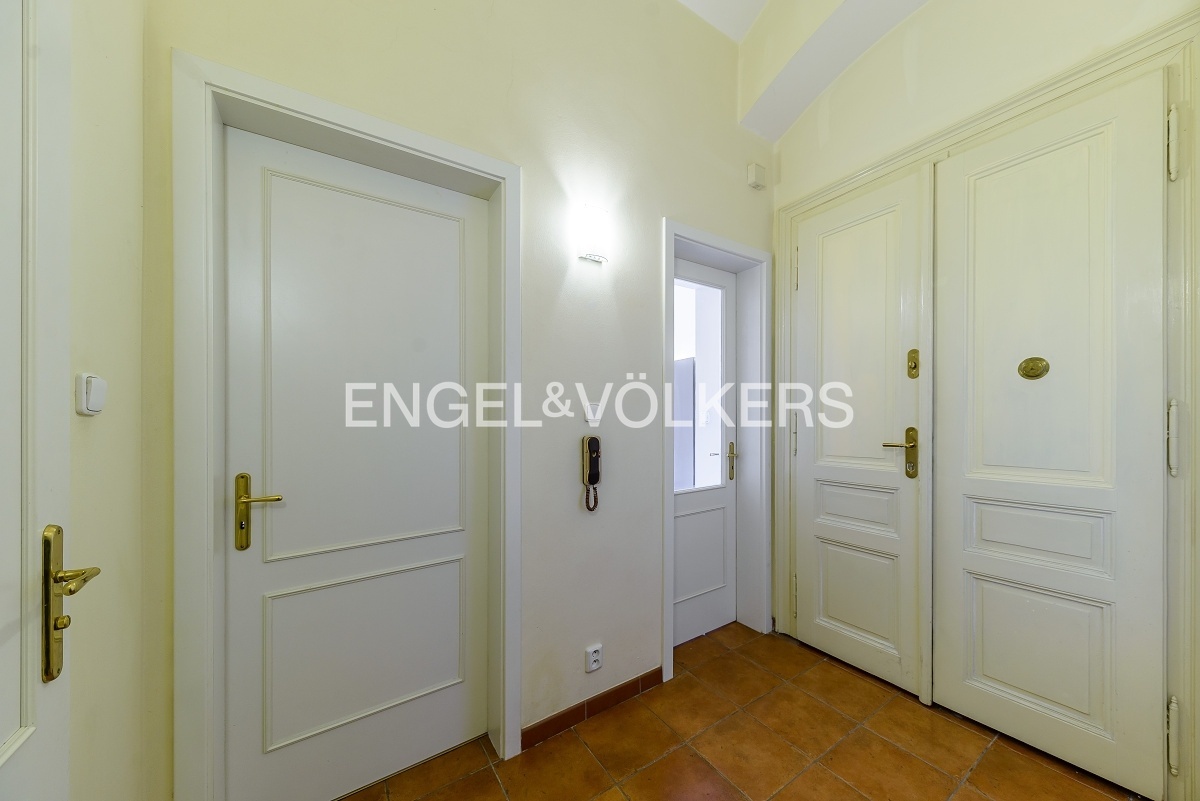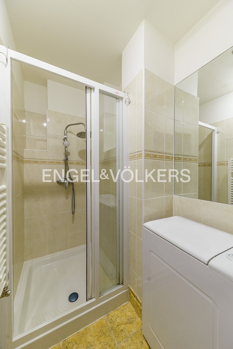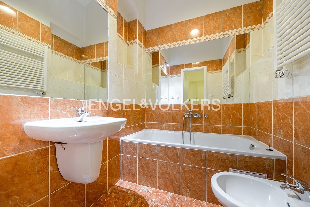 Prakticky řešená dispozice bytu se skládá ze vstupní místnosti, dvou koupelen (první disponuje vanou, toaletou a bidetem a druhá sprchovým koutem a pračkou). Další toaleta v oddělené místnosti.