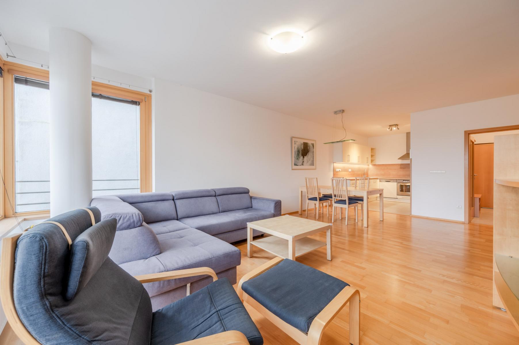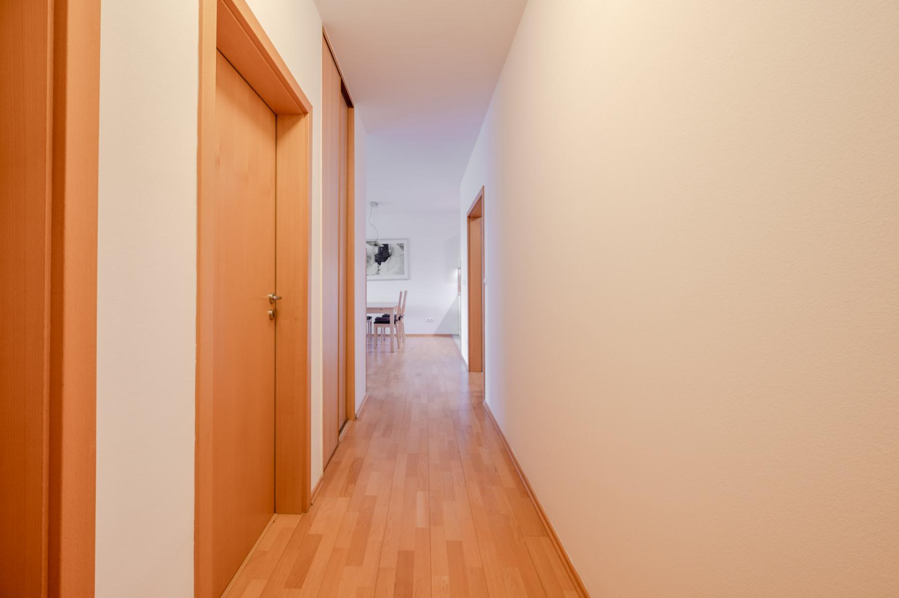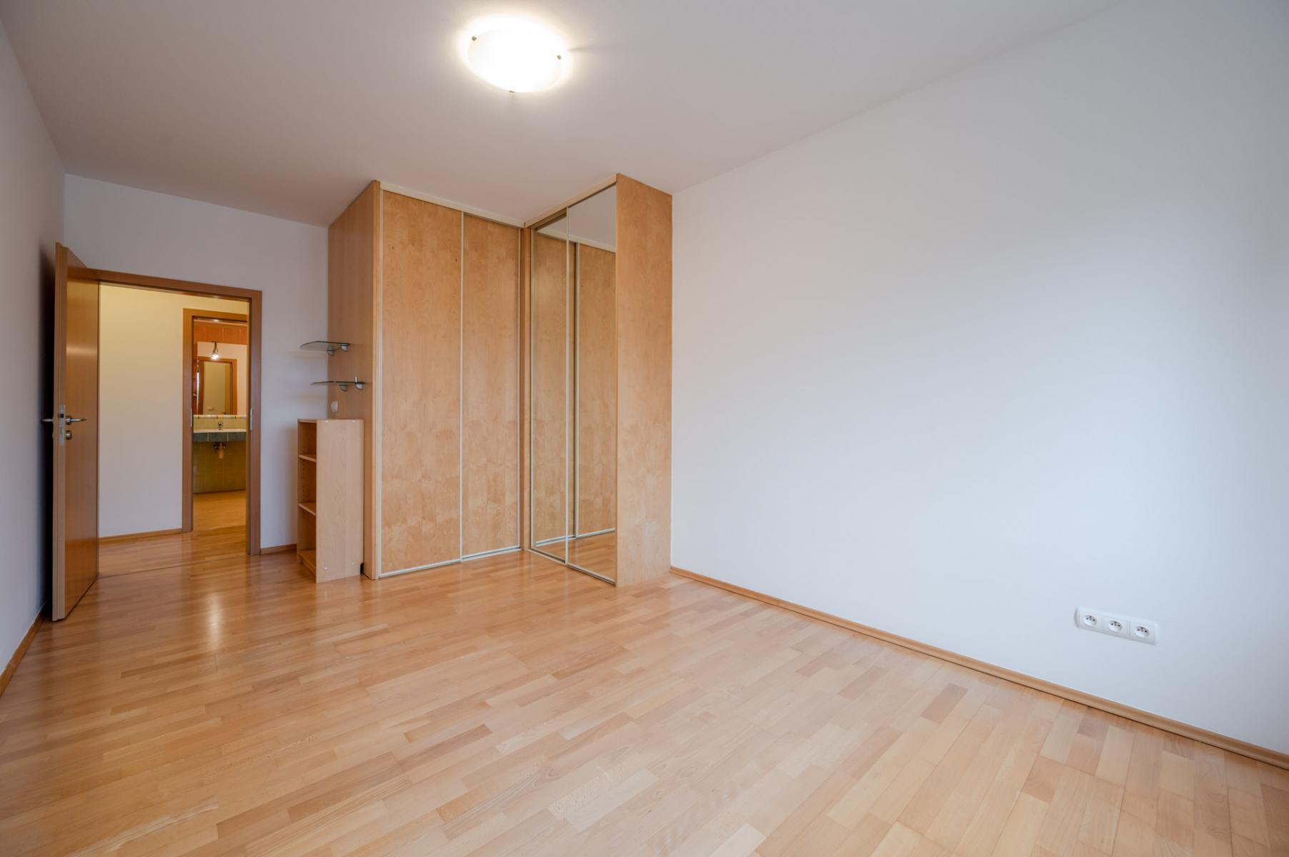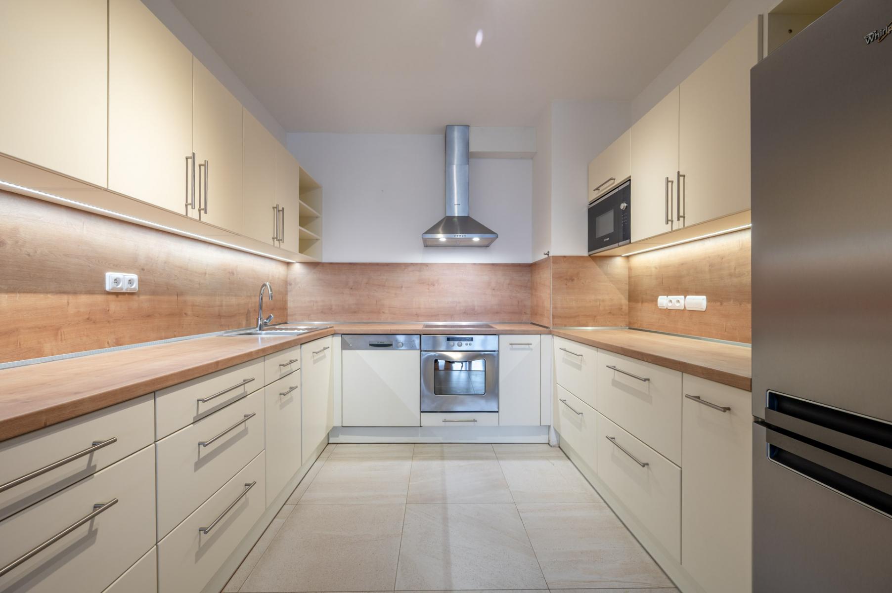 Byt má atraktivní dispozici s prostorným obývacím pokojem, rohovým kuchyňským koutem, vstupem na balkon, 2 ložnicemi, 2 koupelnami, šatnou a předsíní. Kuchyňská linka je výborně řešena, má velkou pracovní plochu, spoustu úložného prostoru a je vybavena veškerými spotřebiči. Vestavěné skříně a šatna pojmou velké množství vašich věcí. K dispozici je i sklep. Interiér je díky velkorysé dispozici a orientaci světlý a vzdušný. Okna a terasa směřují na východ, do zeleně.