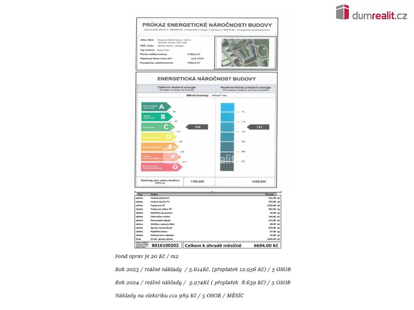 - Ukazatel energetické náročnosti budovy: 102 kWh/m²