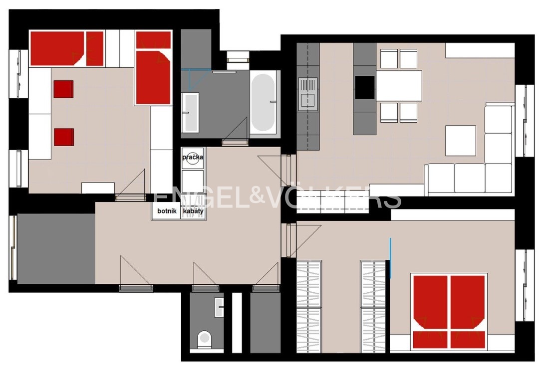 Byt se nachází ve 4. nadzemním podlaží udržovaného činžovního domu s výtahem do mezipatra a nabízí se k pronájmu jako částečně vybavený. Praktická dispozice zahrnuje prostornou vstupní halu s úložnými prostory, ze které se vchází do jednotlivých místností: samostatné ložnice, kterou lze využít také jako pracovnu, dále hlavní ložnice, která je propojena s walk-in šatnou, a v neposlední řadě obývacího pokoje propojeného s plně vybavenou kuchyní se všemi spotřebiči. V bytě je dále koupelna se sprchovým koutem i vanou a samostatná toaleta.