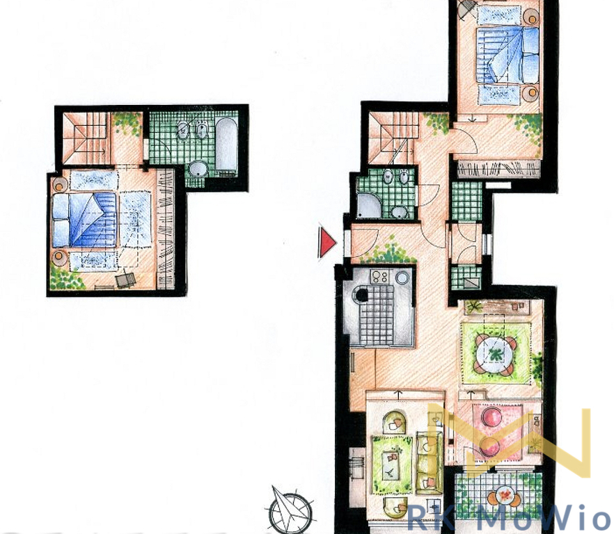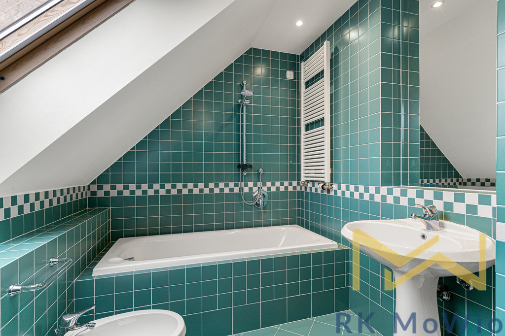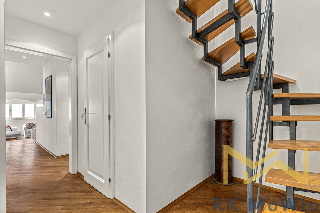 Spodní patro bytové jednotky nabízí vstupní halu, vzdušný obývací pokoj se střešními okny a původními prvky, jídelní prostor se vstupem na terasu, kuchyňský kout, 1 ložnici s průchozí šatnou, 1 koupelnu (se sprchou, umyvadlem, bidetem a toaletou) a 2 komory. Horní patro disponuje hlavní ložnicí a 1 koupelnou (s vanou, umyvadlem, bidetem a toaletou). Vybavení bytu: kuchyňská linka včetně lednice s mrazákem, plynové varné desky, digestoře, myčky, elektrické a mikrovlnné trouby; vestavěné skříně, přípojka pro pračku a sušičku, příprava pro vysokorychlostní internet, dřevěné podlahy a dlažba. Foto je ilustrativní.