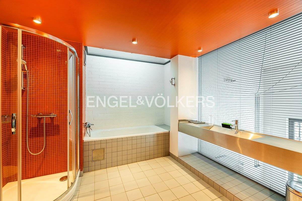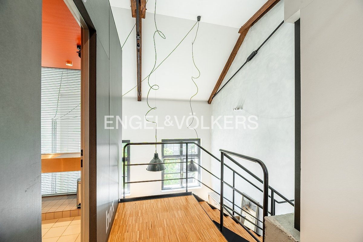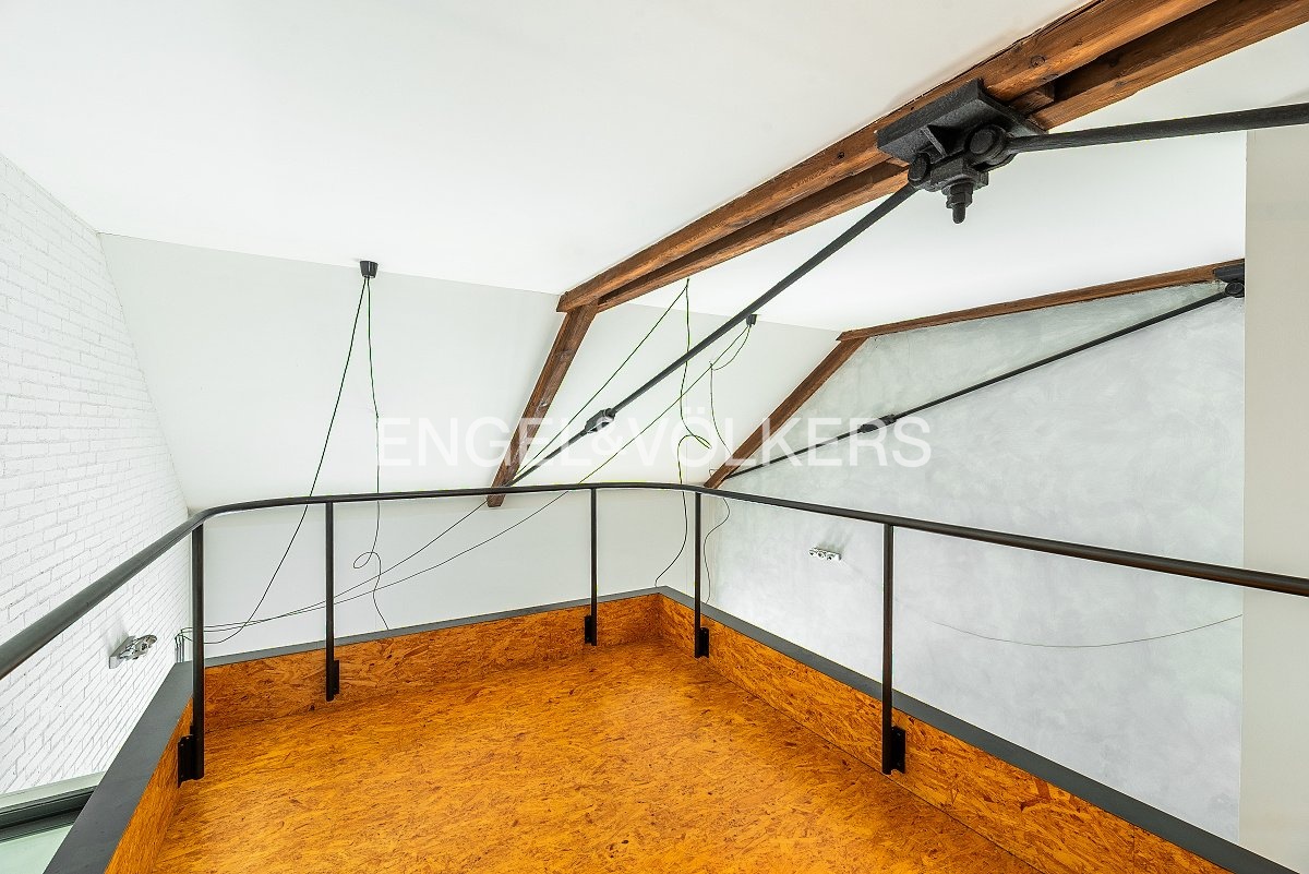 Jedinečný interiér kombinující ultramoderní prvky s prvky industriálního dědictví a 8 m vysokým stropem. Součástí bytu je bar s původními sedačkami pražské tramvaje Tatra T3 z počátku 60. let. Velká okna orientovaná na jih do klidného kancelářského/obchodního parku lemovaného stromy přímo v srdci nově navržené pražské umělecké čtvrti. Celková plocha 146 m2 je dispozičně rozvržena do tří podlaží.