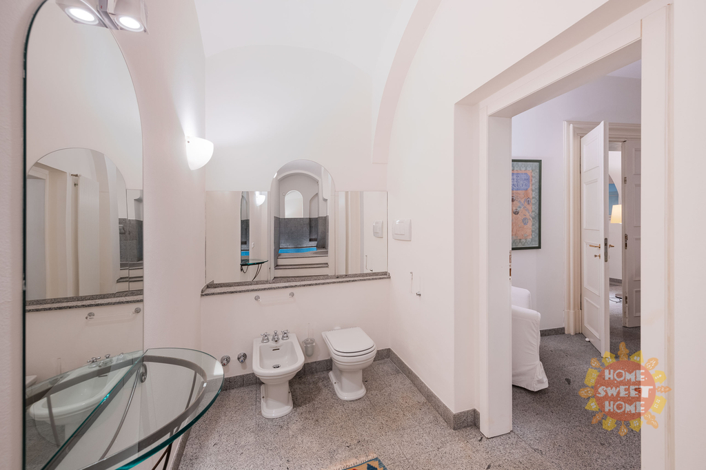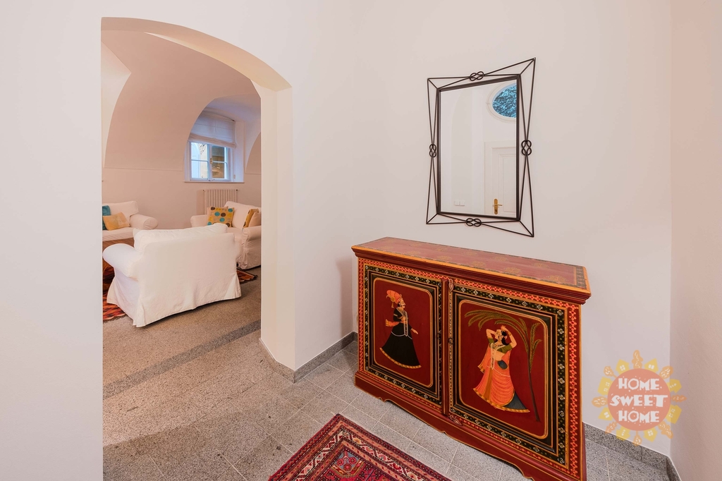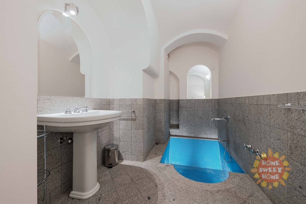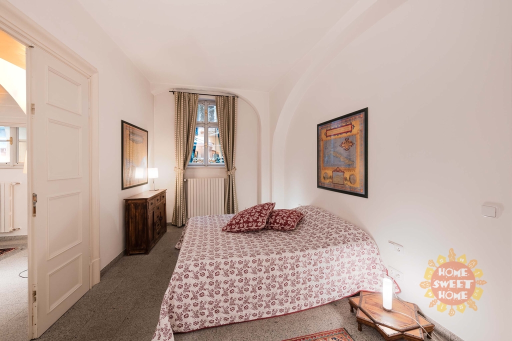Nabízí 92 m² obytné plochy ve dvou místnostech s původními gotickými oblouky.Byt dispozice rozkládací pohovkou, kuchyní, (sklokeramická varná deska, mikrovlnná trouba, lednice, mrazák a myčka), jídelnou a obývacím pokojem. Dále je zde ložnice o velikosti 17 m² s šatnou a prostornou koupelnou vybavenou hlubokou mozaikovou vanou o rozměrech 160 × 160 cm, druhá koupelna (velký sprchový kout, umyvadlo, toaleta a bidet) a komora.