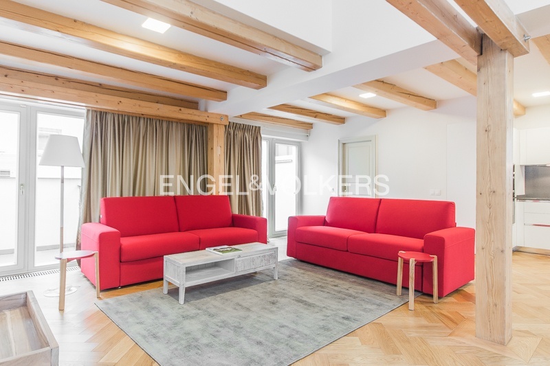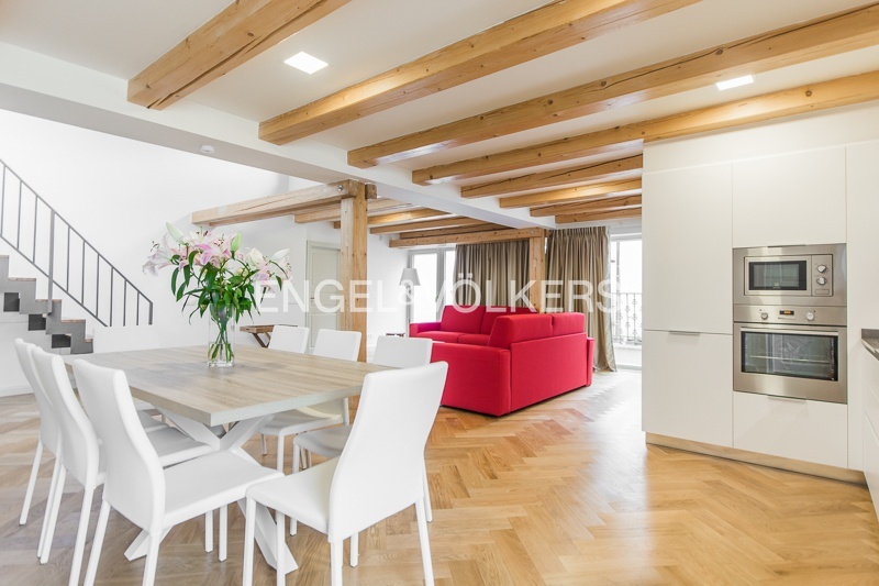 Ústřední místností tohoto jedinečného bytu je prostorný obývací pokoj s obnaženými trámy, který je propojený s jídelnou a kuchyní. Na míru vyrobená italská kuchyně s veškerými spotřebiči nabízí veškerý komfort moderního vaření.
