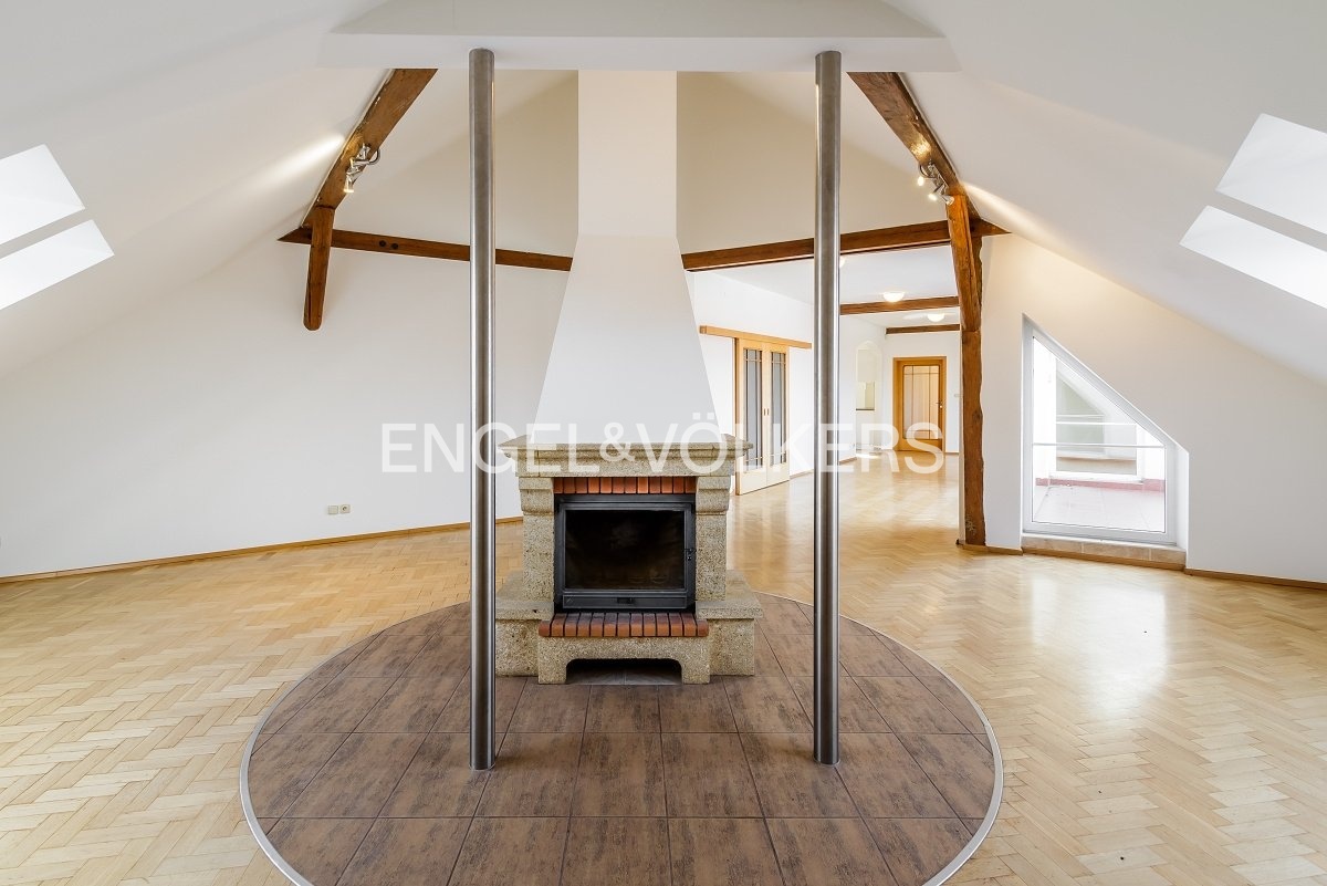 Byt disponuje terasou 14 m² orientovanou na východ a balkonem 6 m², které poskytují příjemný prostor pro relaxaci a posezení s výhledem na město. Interiér zahrnuje velké ložnice, obrovskou jídelnu, dvě koupelny a krb, který dodává prostoru útulnou atmosféru.