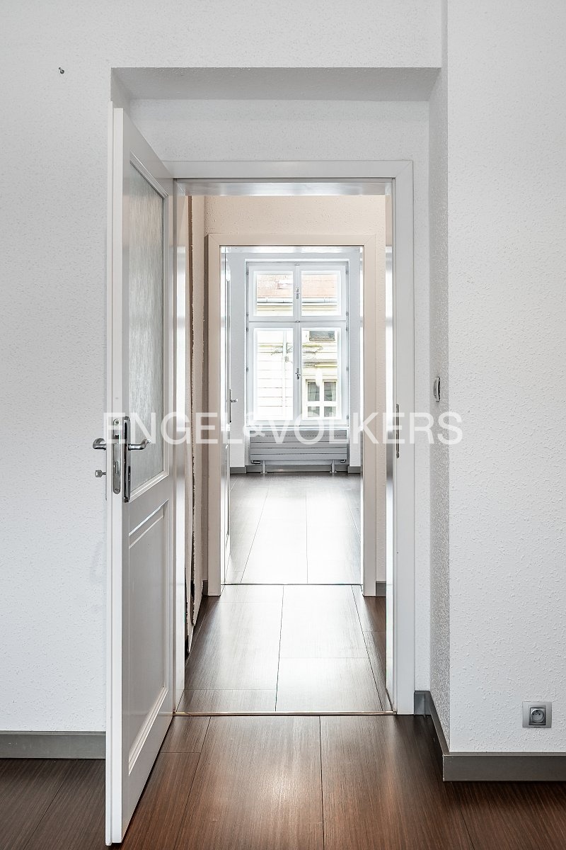Dominantou bytu je prostorný obývací pokoj s kuchyňskou linkou o výměře 45 m². Veliká okna a jižní a západní orientace zajišťují výjimečné prosvětlení interiéru a příjemnou atmosféru po celý den. Dispozice dále zahrnuje vstupní halu, dvě samostatné ložnice – jednu orientovanou do klidného vnitrobloku s vlastní šatnou a druhou s výhledem do ulice – dvě koupelny a samostatnou toaletu s umyvadlem.