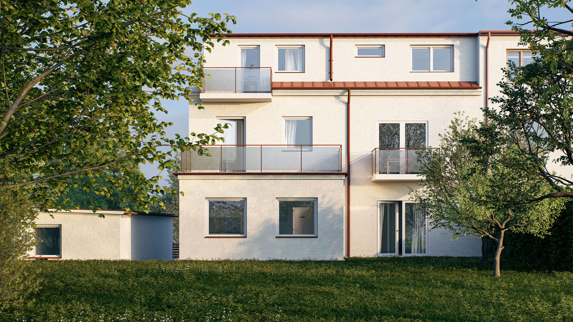 • Byt 4+kk (104 m²) ve 2. nadzemním podlaží má podobné uspořádání, balkon a rovněž dvě koupelny. Výhled z balkonu do zahrady a z některých oken bytu směřují výhledy na přírodní park Obora Hvězda. Měsíční nájem činí 36 000 Kč.