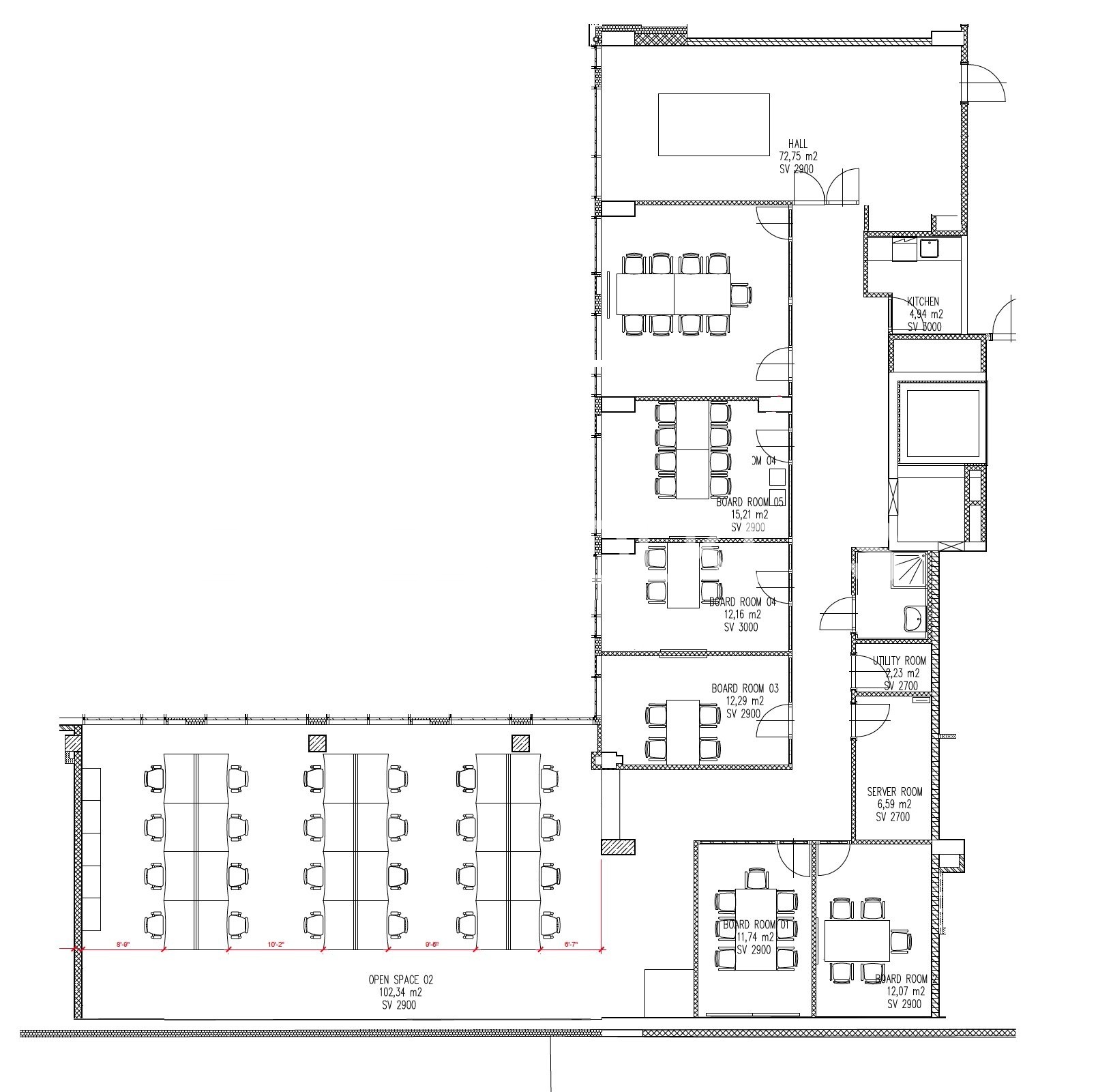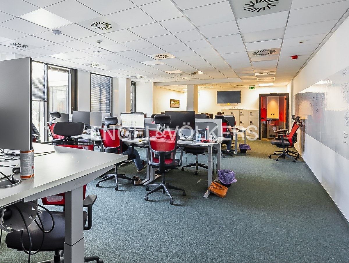 K pronájmu nabízíme kancelářské prostory na výjimečné adrese v Karlíně, které se nacházejí v prvním patře budovy Karolína Plazza. Celková plocha činí 288,6 m² a je dispozičně řešena jako jeden velký open space pro přibližně 24 osob, doplněný o šest samostatných místností, které slouží jako zasedací místnosti.