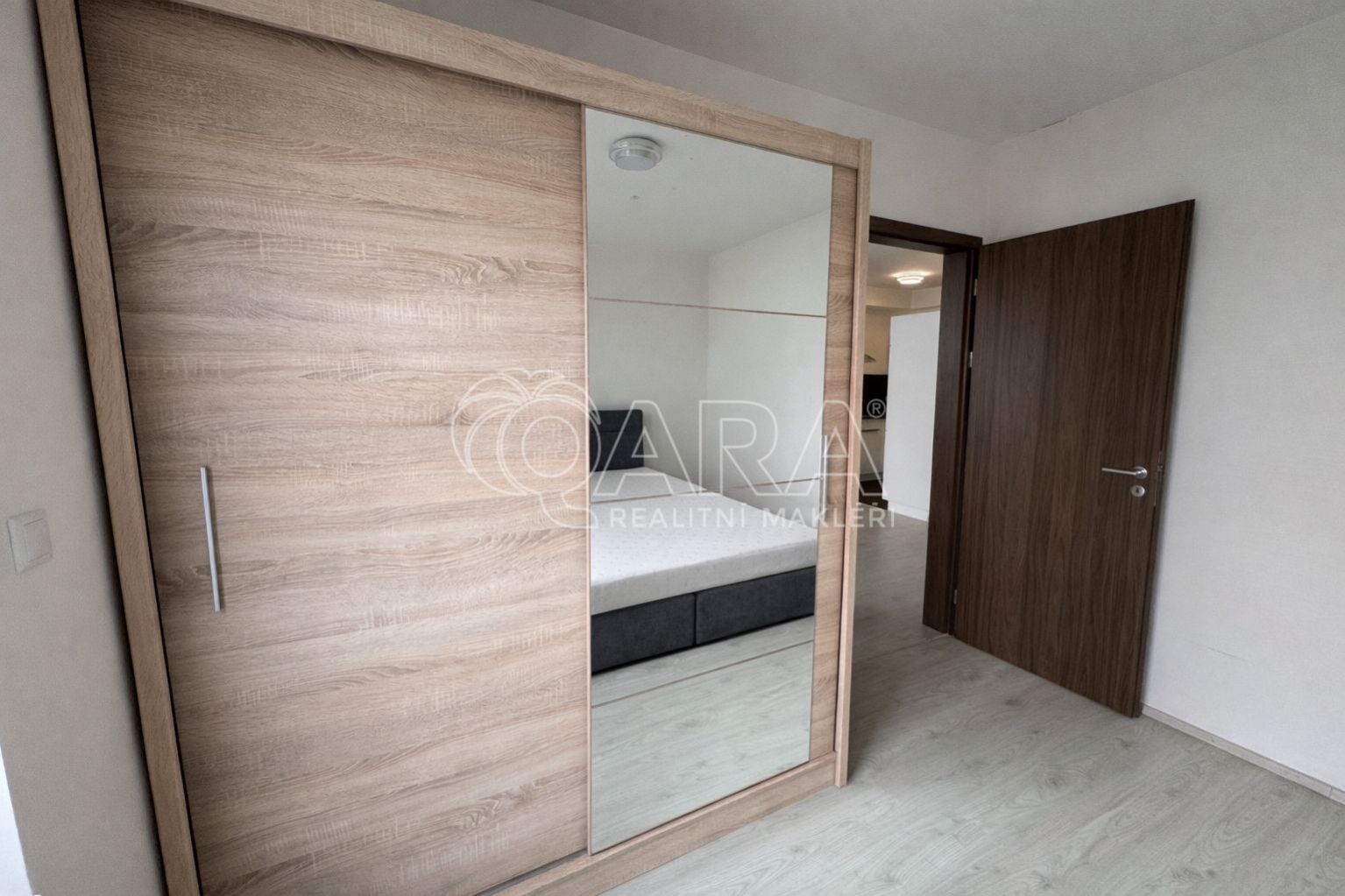 Zařízený byt 2+kk o celkové ploše 53m, s balkónem (5m), sklepem (2m) , garážovým stáním a komorou v bytě. Byt se nachází ve 2. podlaží 6 let staré nízkoenergetické budovy v Praze 5 (projekt Jižní výhledy). Byt je vybaven nábytkem (jídelní stůl, konferenční stolek, možnost sedačky, postel, skříň, kuchyňská linka se sklokeramickou varnou deskou, digestoří, myčkou, multifunkční troubou a chladničkou s mrazákem. V komoře je pračka, v koupelně sprchový kout, toaleta a umyvadlo. V domě je k dispozici internet a kabelová TV (není zahrnuto v ceně).