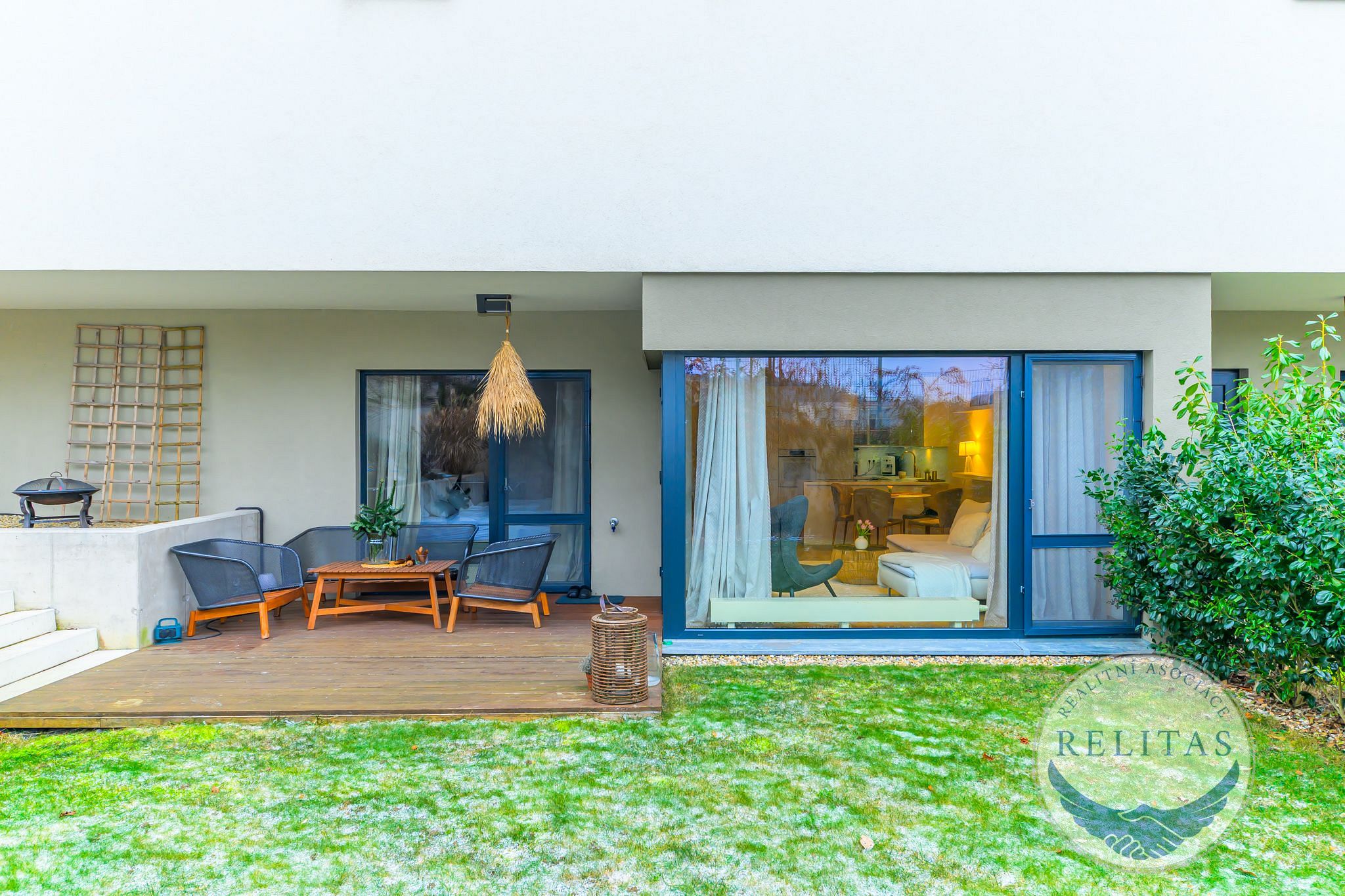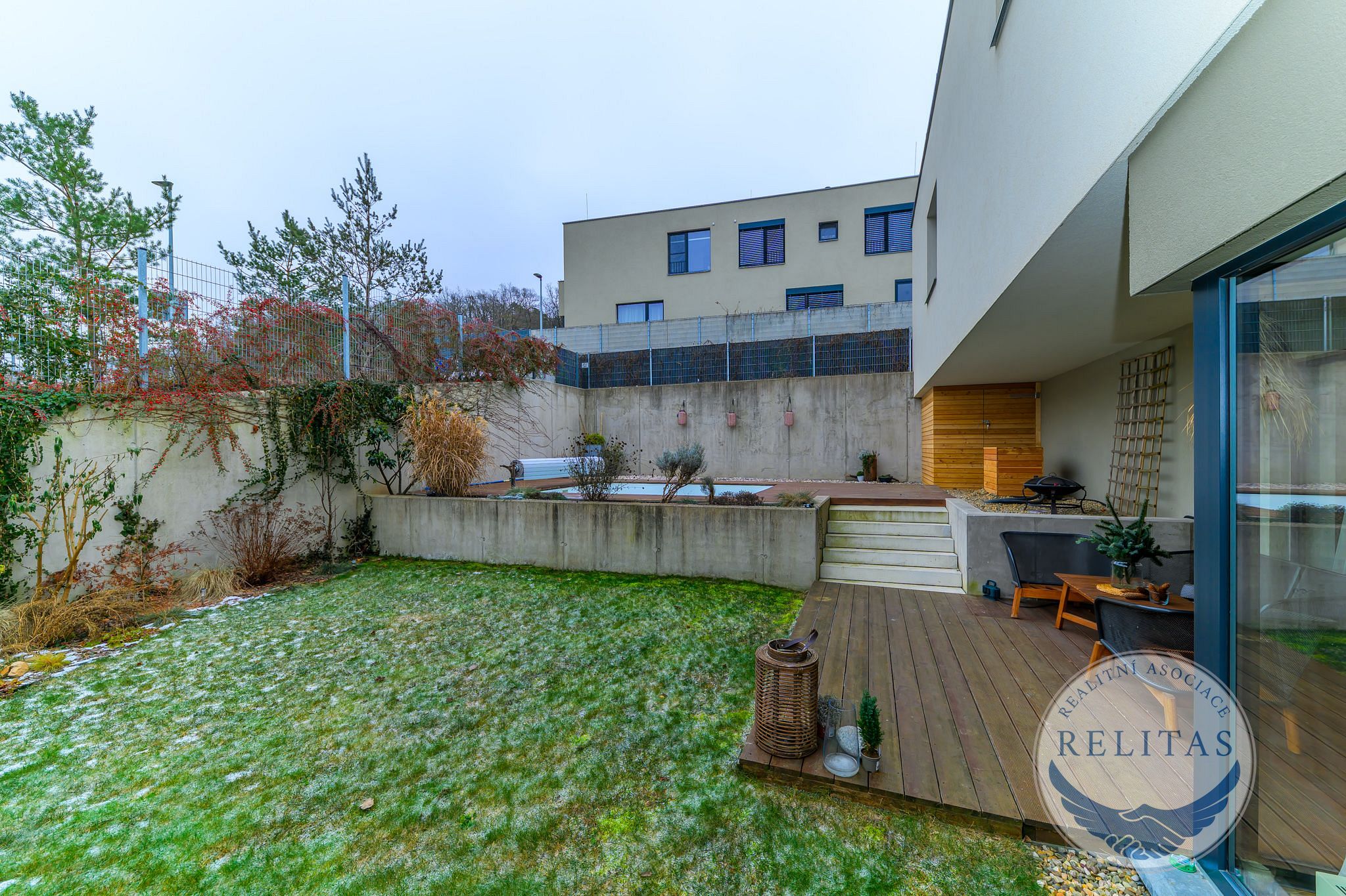 Dispozici tvoří vstupní předsíň, světlý obývací pokoj s plně vybavenou kuchyňskou linkou, ložnice, koupelna s vanou a samostatné WC. Z obývacího pokoje je přímý vstup na terasu a do zahrady, kde je umístěn bazén, prostor pro posezení i místo pro gril nebo menší zahradní domek. K bytu náleží extra široké garážové parkovací stání (cca 4 × 5 m) v suterénu domu.