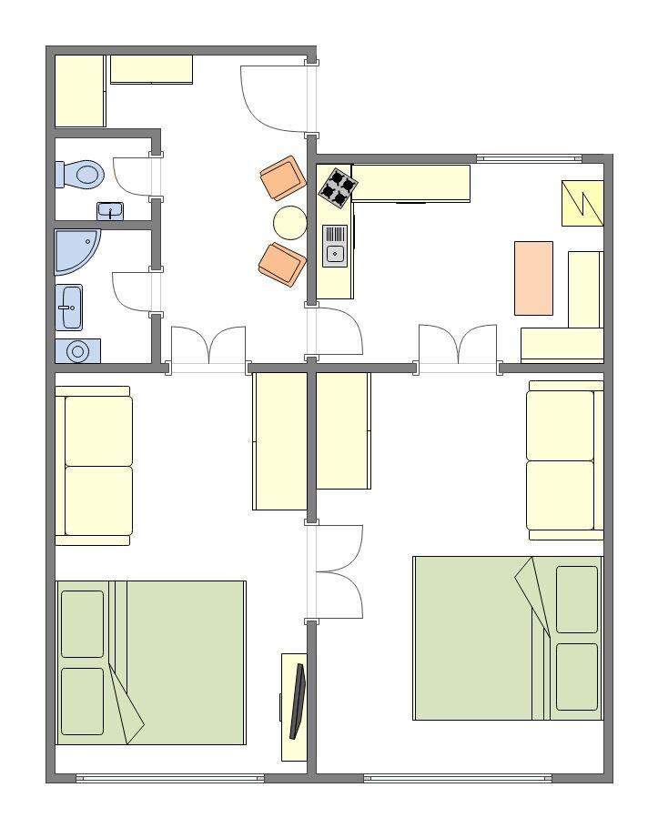 Obě ložnice jsou zařízené jako neprůchozí s orientací na severozápadní stranu s volným výhledem do jednosměrné ulice. Třetí místnost je užívána jako centrální s kompletně vybavenou kuchyňskou linkou, která zahrnuje vestavěné a drobné spotřebiče (plynový sporák, elektrická trouba, digestoř, mikrovlnná trouba, myčka, lednice s mrazničkou, kávovar, rychlovarná konvice, toustovač). Koupelna je zařízena sprchovým koutem, umyvadlem s umyvadlovou skříňkou, otopným žebříkem a kvalitní pračkou zn. Indesit. Toaleta je samostatná.