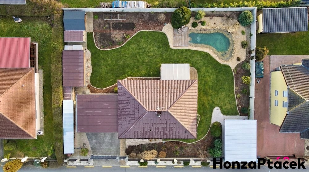 Na zahradě se nachází koupací přírodní jezírko s vodopádem (2025), dva zahradní domky, dřevník, zastřešené stání pro dvě auta a pergola přizpůsobená pro obytný vůz. Na okraji pozemku je zahradní domek s dílničkou a druhý jako sklad nářadí. Na zahradě najdete - okrasné dřeviny, ovocné stromy a keře, nový trávník, vyvýšené záhony tvořící příjemné zázemí pro odpočinek i drobné zahradničení. Zahrada byla v uplynulém roce kompletně revitalizována. Součástí prodeje je také zásoba dřeva na několik topných sezón - cca 16 m3. Pozemek má dva vjezdy opatřené posuvnými bránami (jedna s elektromotorem).