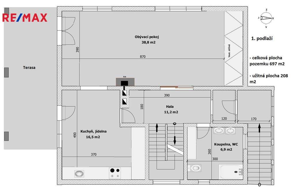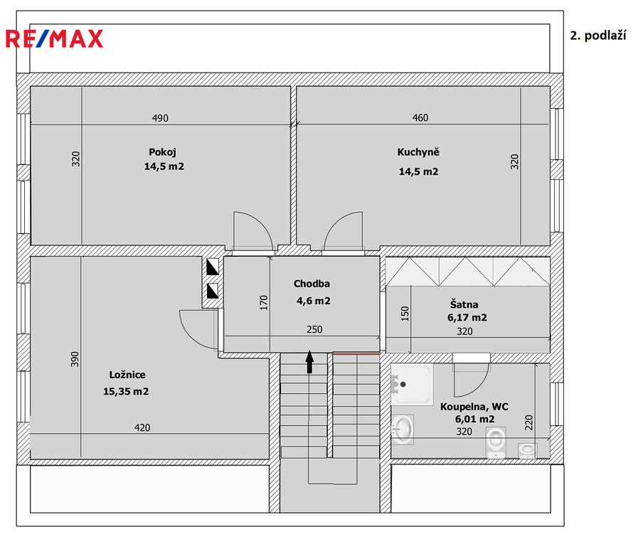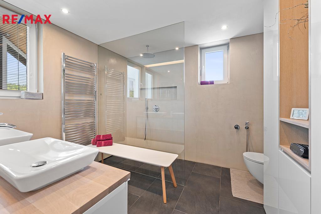 Z chodby je přístup do druhého podlaží, kde jsou dva pokoje, koupelna se sprchovým koutem a s WC, šatna a samostatná kuchyně. V chodbě je výlez na půdu, kde by byla možnost vybudování podkroví o vel. cca 60 m2.