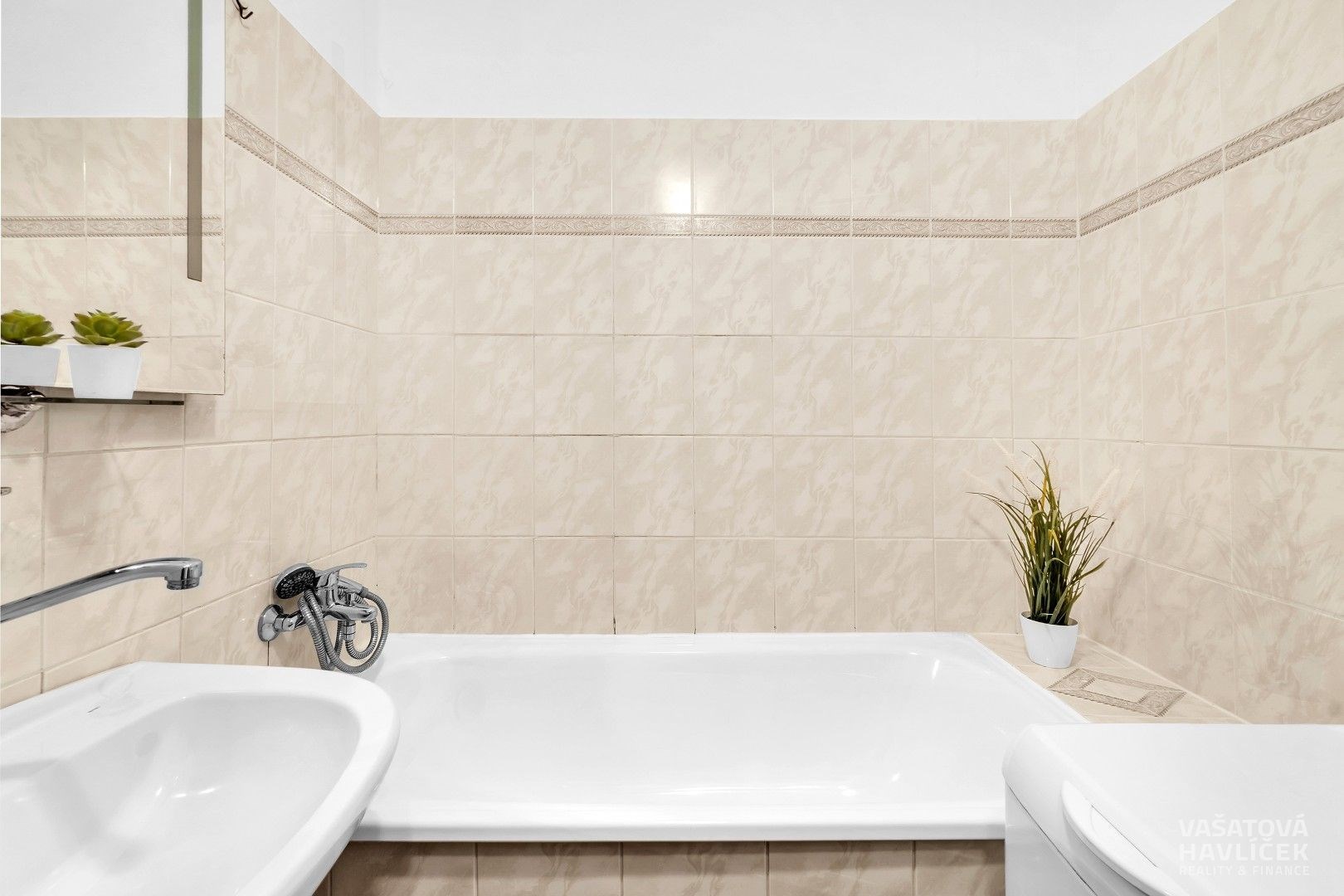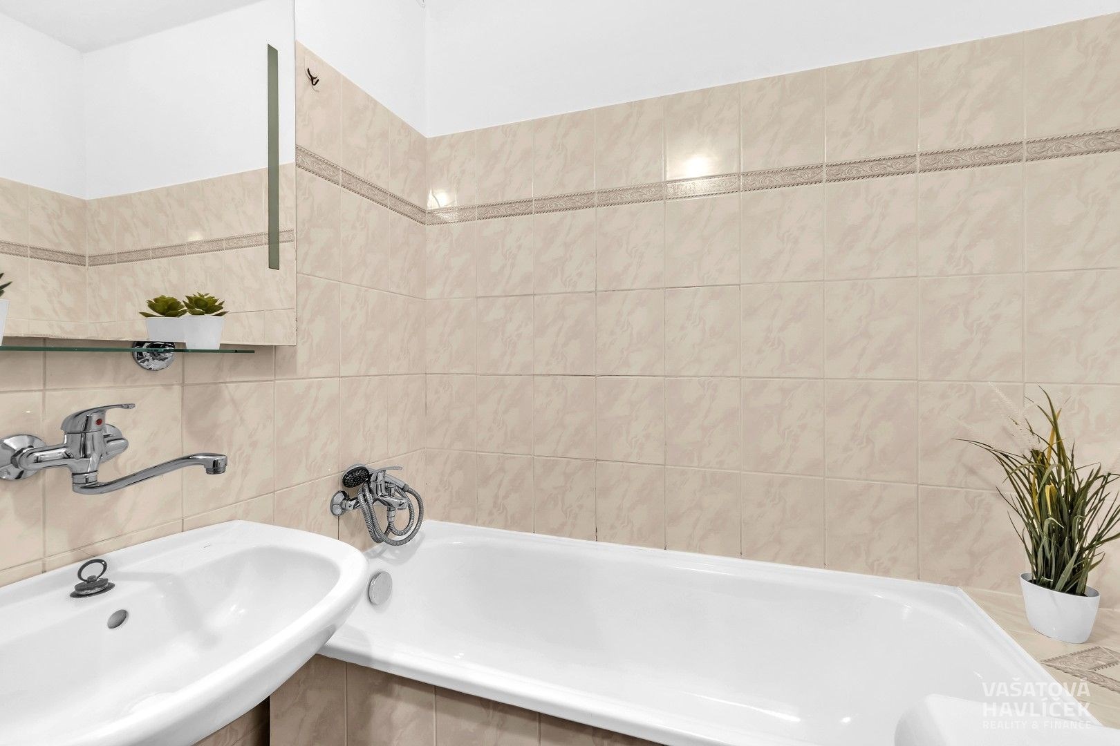 > vana, umyvadlo, zrcadlo a pračka