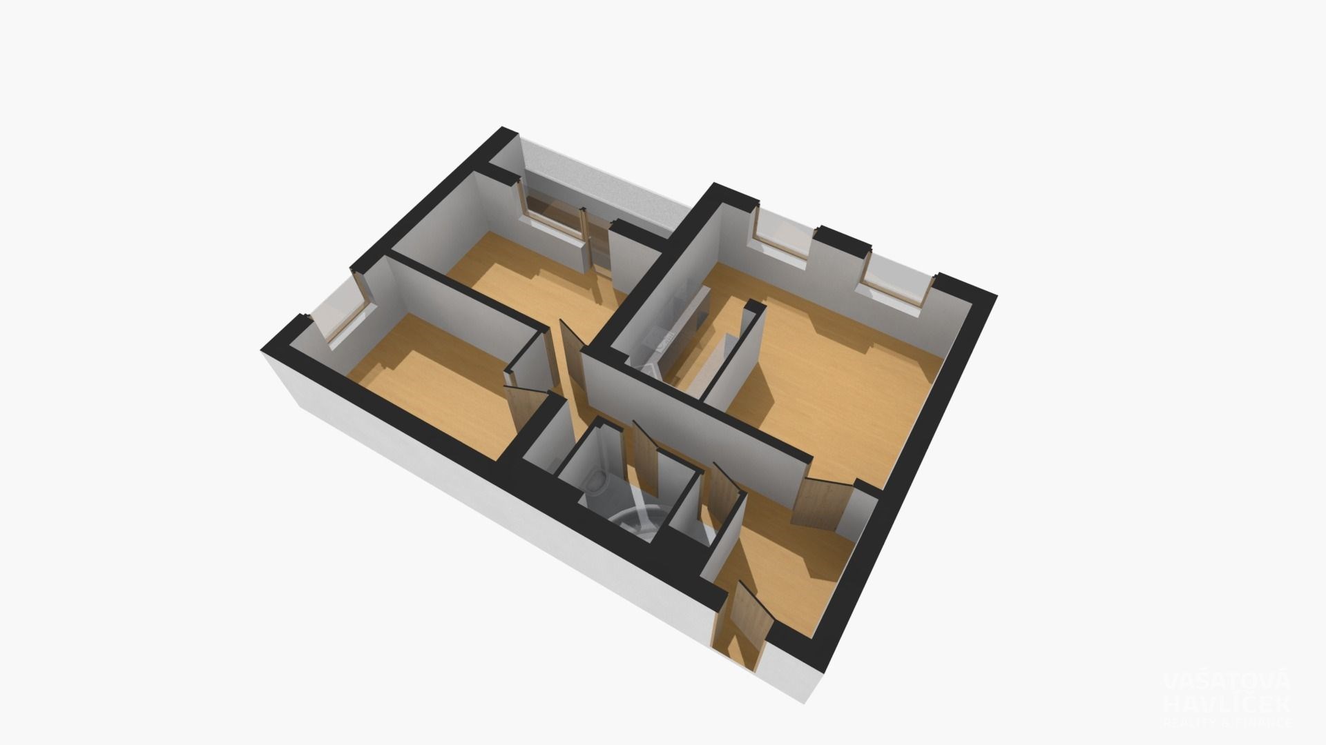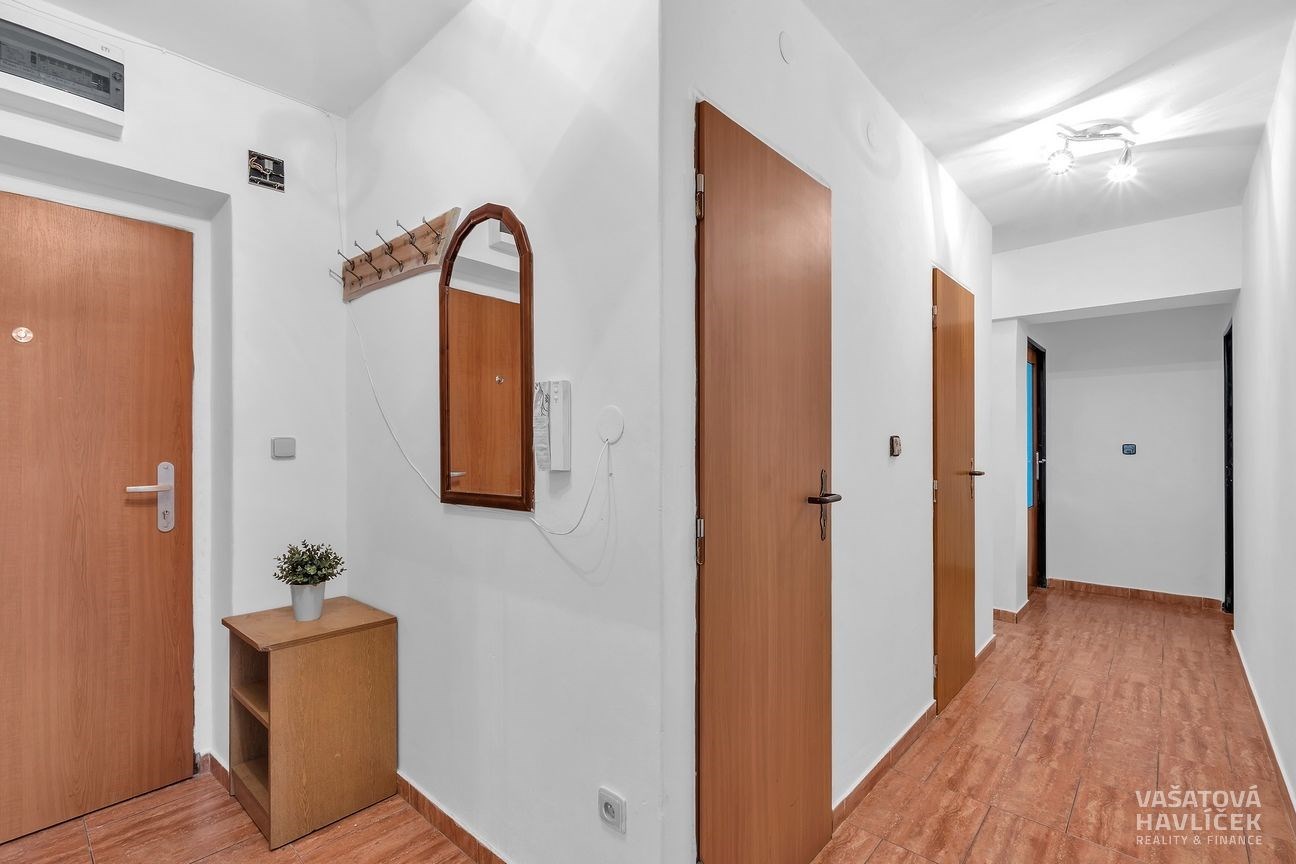 Byt je orientovaný na dvě světové strany – jeden pokoj směřuje na sever, obývací pokoj s kuchyňským koutem a druhý pokoj s lodžií na východ. V roce 2013 prošel byt kompletní rekonstrukcí, při níž došlo k výměně veškerých rozvodů elektřiny, vody a odpadů, proběhla renovace koupelny, toalety i kuchyně a vyměněno bylo také topení. Dispozice: vstupní chodba, obývací pokoj s kuchyňským koutem, dva neprůchozí pokoje, koupelna s vanou, samostatná toaleta a lodžie. Na podlahách je převážně dlažba, v jednom z pokojů je plovoucí podlaha a v druhém linoleum.