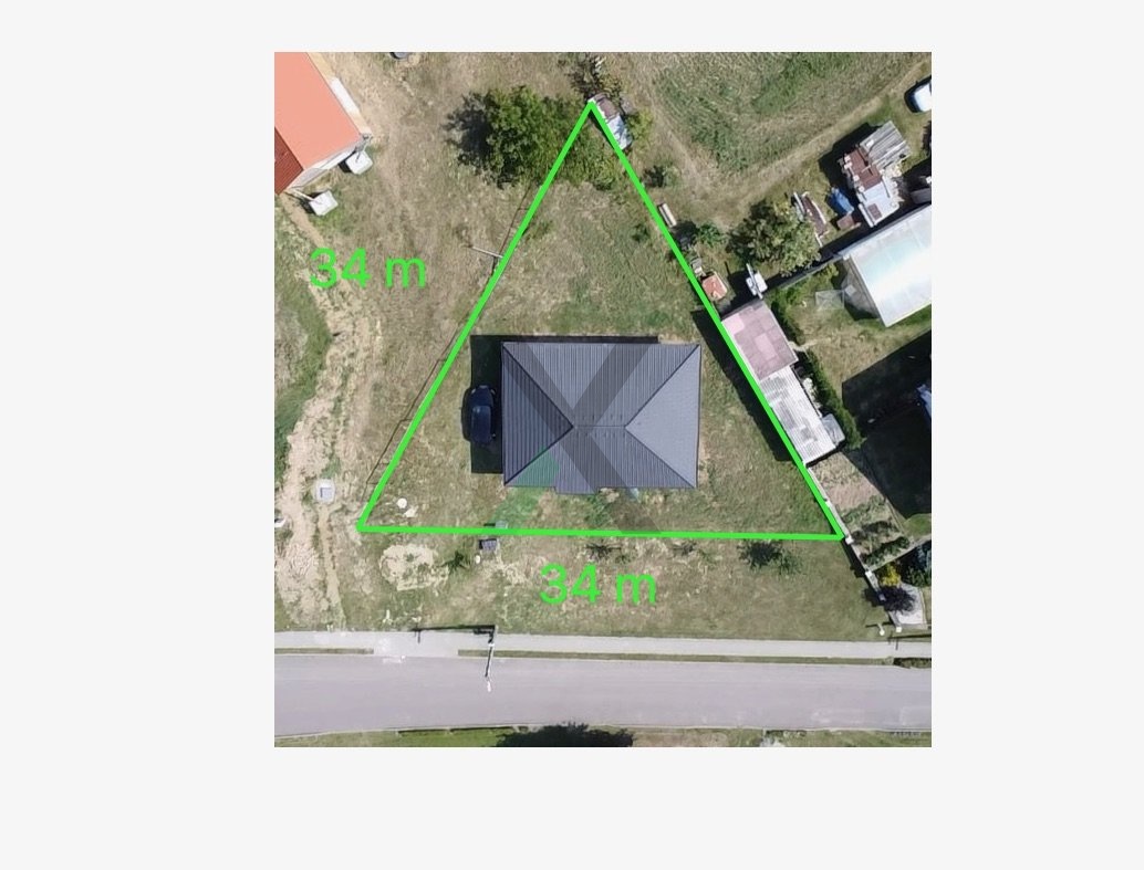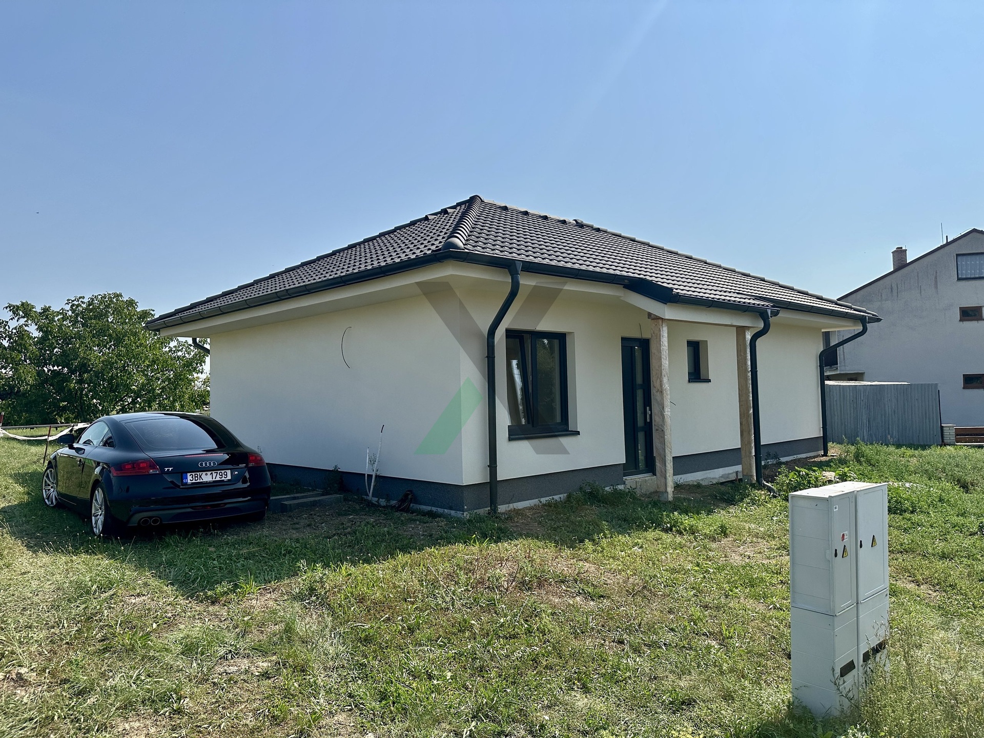 Přízemní bungalov o zastavěné ploše 90 m² stojí na trojúhelníkovém pozemku o výměře 494 m² a nabízí ideální kombinaci moderního bydlení a venkovského klidu.