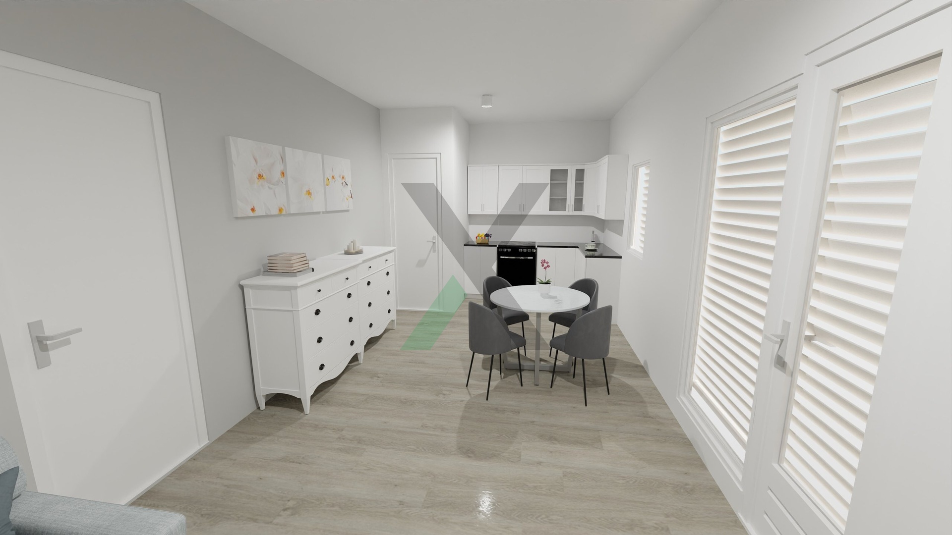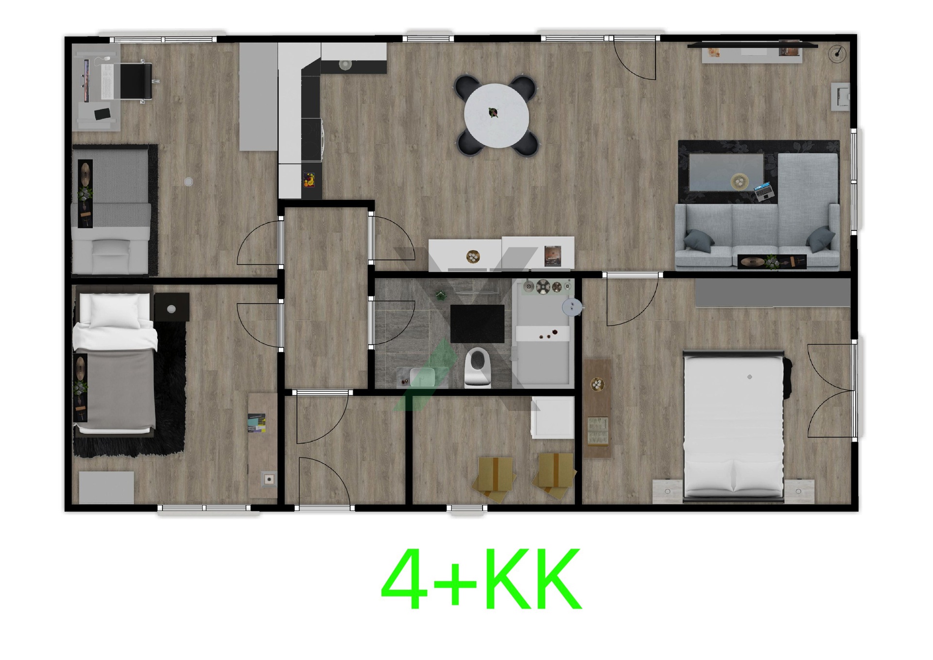 Najdete zde prostorný obývací pokoj s kuchyňským koutem (24 m²), ložnici (12 m²), dva pokoje po 9 m², koupelnu (4 m²) a technickou místnost (4 m²) s místem pro pračku a sušičku.
