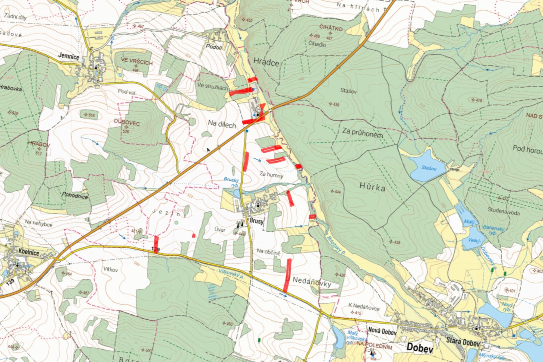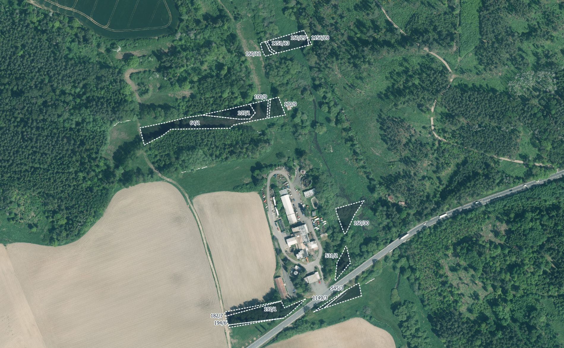 Pozemky jsou vedeny pod čísly 64/1, 100/9, 107/1, 160/12, 160/29, 160/30, 170/9, 182/7, 192/1, 194/6, 406/34, 406/40, 410, 505/6, 531/2, 545/3, 558/3, 559/15, 584, 714/10, 720/6, 809/1, 1002/31, 1060, 1061, 1143/10, 1149/3, 1151/13, 1156/28, 1158/24 a 1158/25.