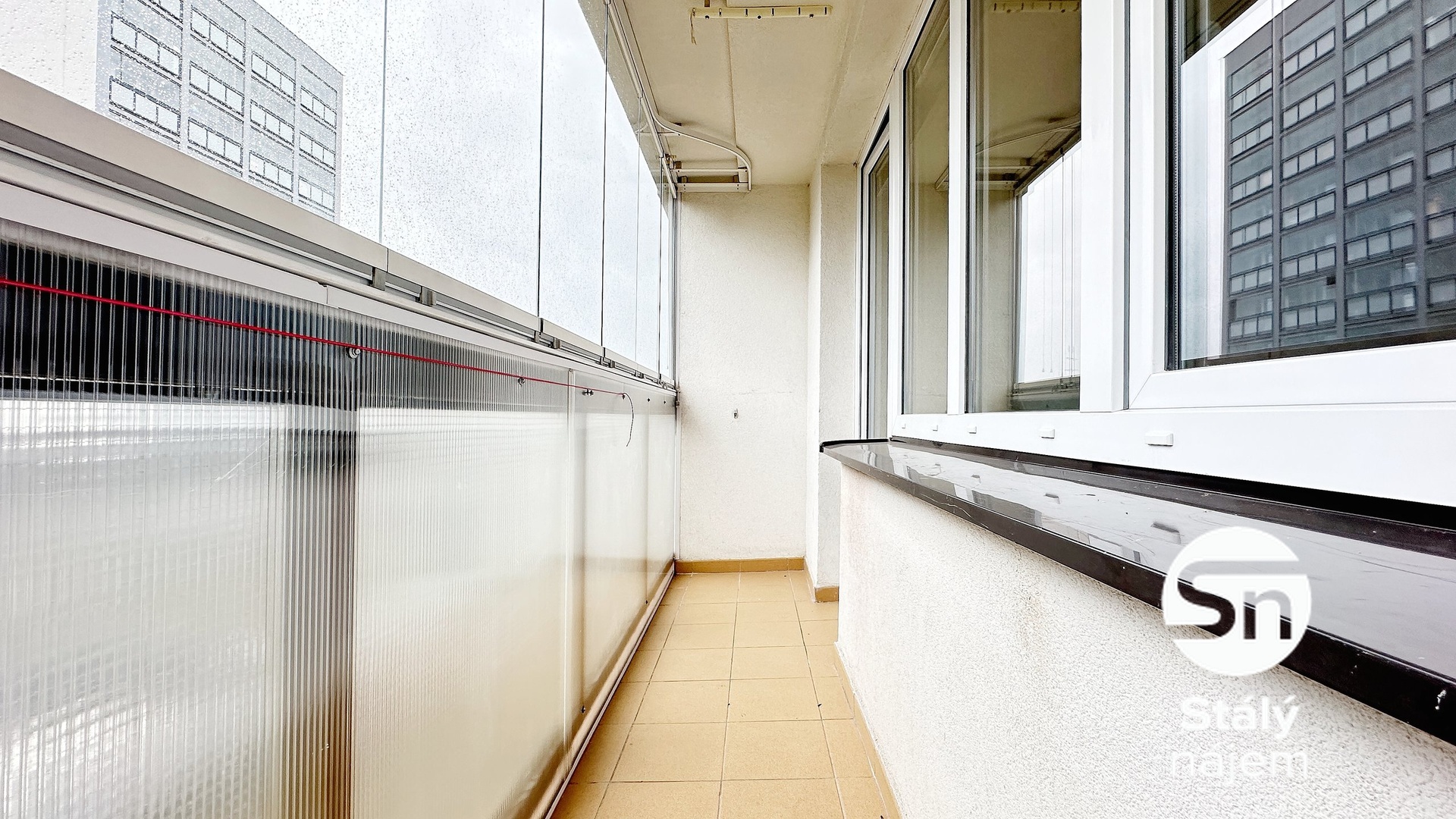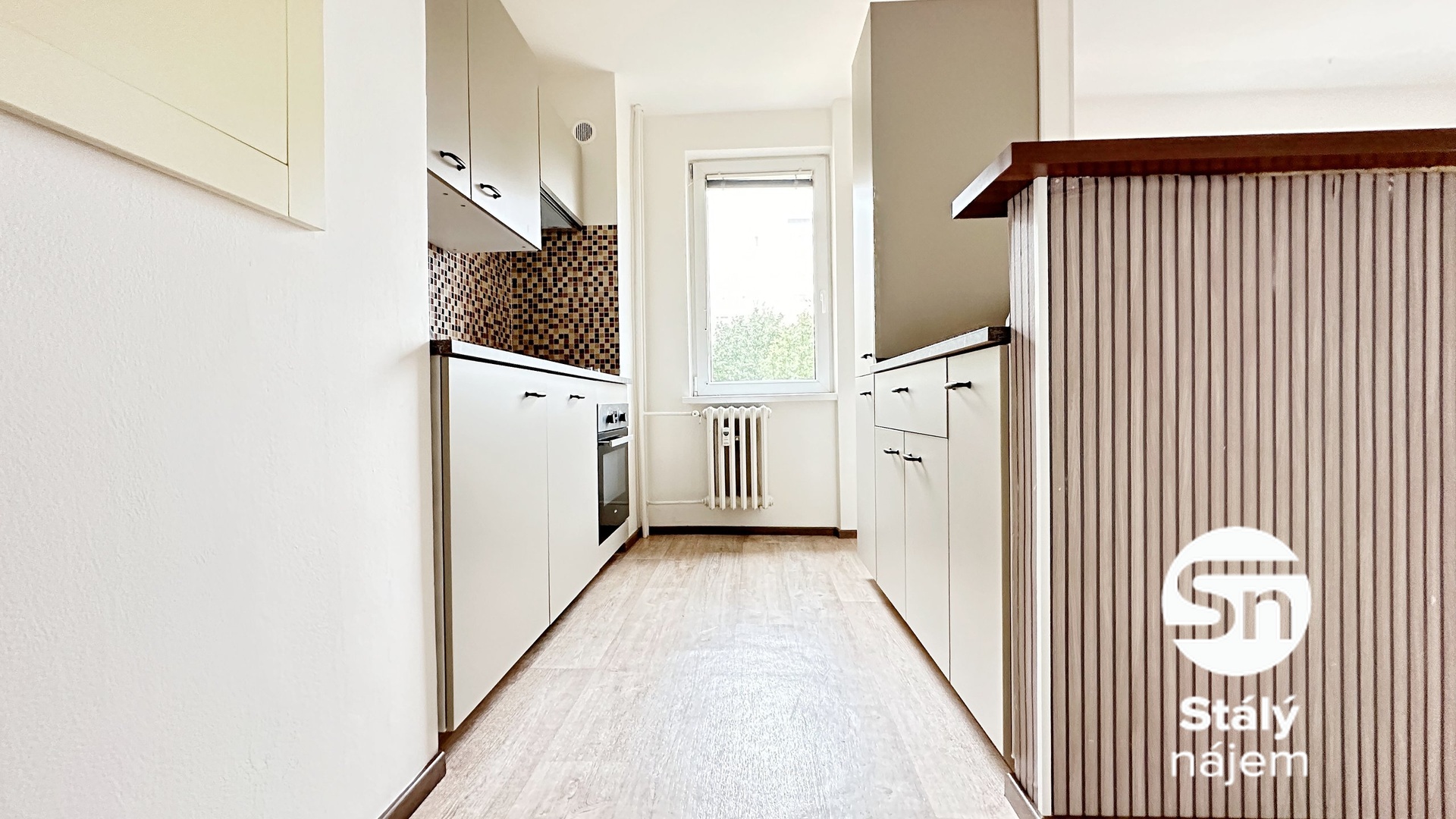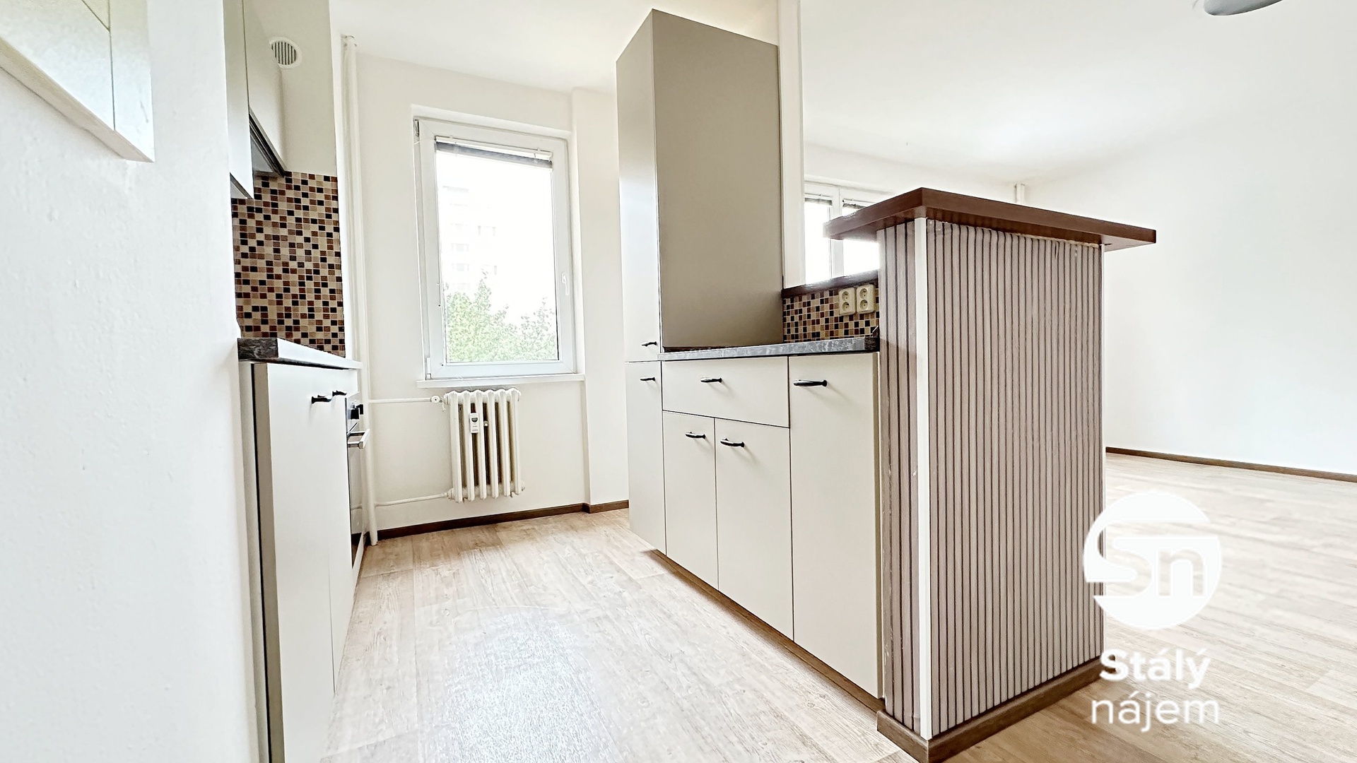 Prostorný obývací pokoj je rozdělen stěnou, za kterou je šikovně řešená kuchyňská linka, která je vybavena elektrickou troubou s plynovým vařičem, digestoří a myčkou. Druhý nezařízený pokoj krásně zařídíte jako ložnici, z pokoje je vstup na zasklenou lodžii. Moderní koupelna je vybavena sprchovým koutem, umyvadlem a skříní pro uložení věcí. Toaleta je samostatně.